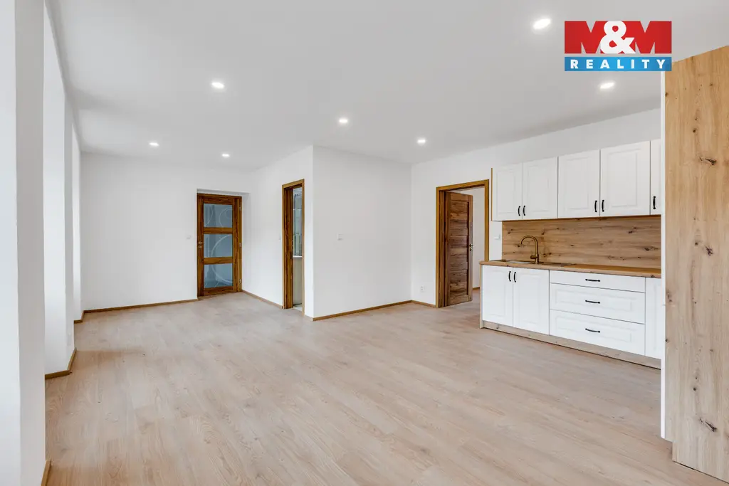 Dům disponuje dvěma byty 3+kk se samostatnými vstupy. První byt o podlahové ploše 104 m² nabízí velkorysý prostor a je vybaven novou kuchyňskou linkou včetně spotřebičů. Vytápění zajišťuje nový elektrokotel. Je zde pěkný sklep.