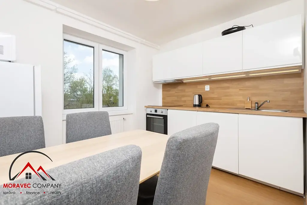 Byt je plně vybaven – nechybí nábytek, spotřebiče i nádobí. Stačí si jen přinést osobní věci a můžete bydlet!