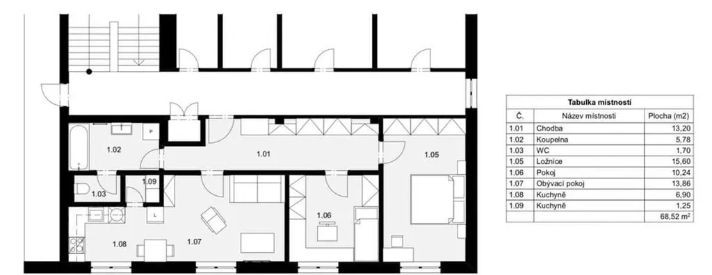 Vnitřní dispozice: prostorná obývací kuchyně ( 20.76 m²) s moderní linkou a elektrickým sporákem propojená s obývacím prostorem, spíž 1,25m2. Dvě samostatné ložnice (15,6 m² a 10,2 m²). Koupelna 5,79m2 s vanou, umyvadlem, topným žebříkem, připojením k pračce a samostatné WC. K bytu dále náleží komora/sklep v přízemí domu.