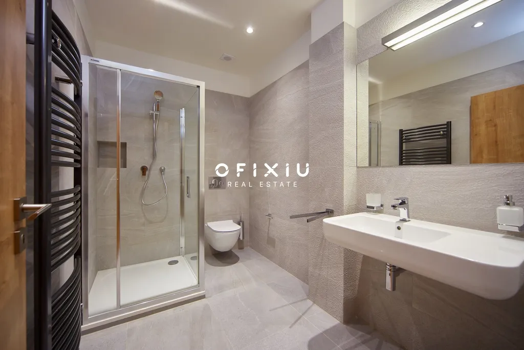 Koupelna je vybavena sprchovým koutem, toaletou a moderním umyvadlem se skříňkou. Dále se v bytě nachází ložnice s dvoulůžkovou postelí, vestavěnými skříněmi, nočními stolky a dostatkem úložného prostoru. Součástí vybavení je také pračka a sušička umístěná ve vestavné skříni. Satelitní signál a internetové připojení jsou zahrnuty v ceně pronájmu.