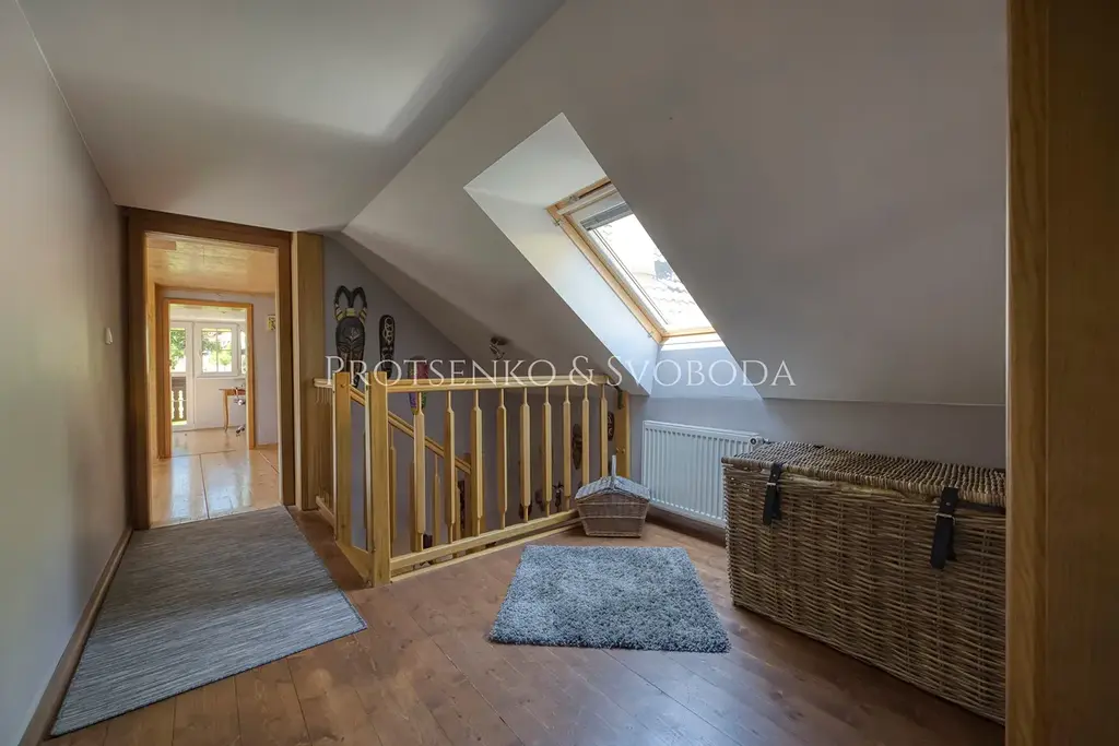 Uvnitř domu vás přivítá obývací pokoj s krbovými kamny, které vnášejí hřejivou atmosféru a pocit skutečného domova. Dvě prostorné garáže nabízejí možnost rozšíření obytné části o další pokoje či ateliér, podle vašich představ. Na pečlivě upraveném pozemku potěší plně funkční udírna pro milovníky poctivé gastronomie, venkovní bazén pro letní osvěžení a samostatný zahradní domek proměněný v privátní wellness zónu s útulnou saunou – ideální místo k odpočinku a regeneraci.