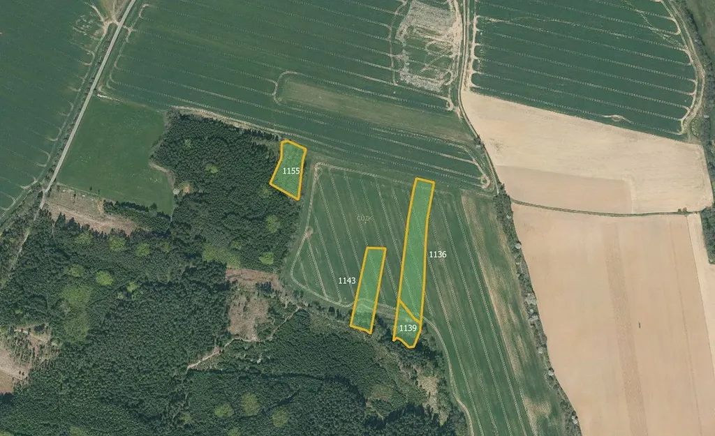 Celková výměra uvedených parcel je 116 361 m2. Vlastník na nich nabízí k prodeji svých 19 394 m2. Z toho orná půda je 11 955 m2, trvalý travní porost 1 016 m2, lesní pozemek 6 421 m2 a vodní plocha 2 m2.