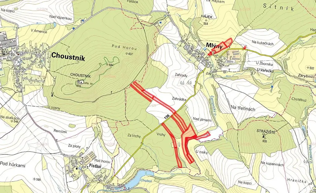 Předmětem prodeje je na parcelách č. 39/4, 39/5, 283/2, 284, 285, 290, 365/8, 367, 368, 382/3, 382/7, 382/10, 382/13, 384, 386, 413, 781/3, 820/4, 923, 933/4, 980/1 a 980/4 zapsaných na LV 169 v KÚ Mlýny u Choustníku.
