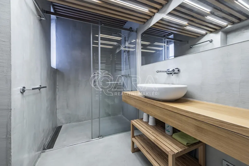 Moderní koupelna se sprchovým koutem a samostatná toaleta navazují z každé strany na předsíň, kde opět naleznete vkusně zabudované úložné prostory.