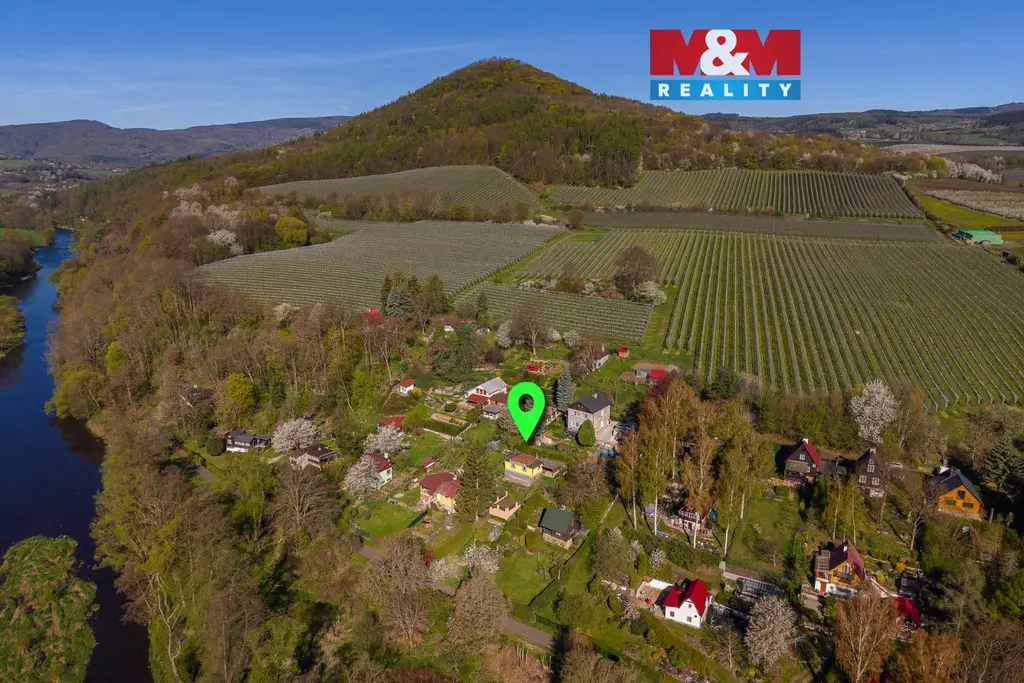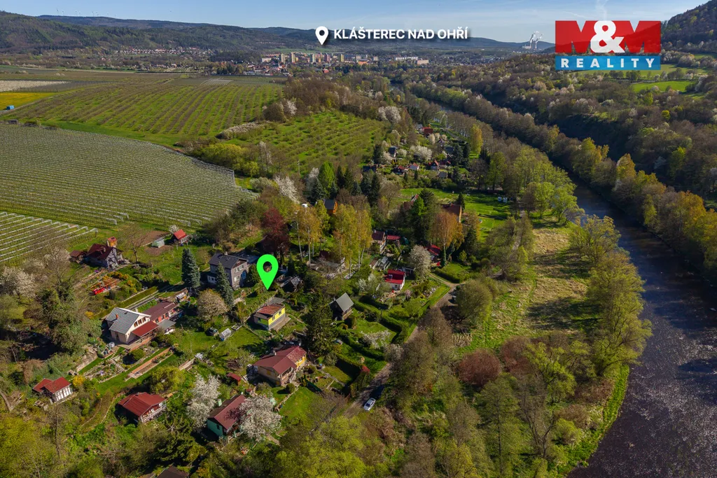 Nabízíme k prodeji zahradu s chatou se zastavěnou plochou 46 m², situovanou v klidné a vyhledávané lokalitě, s krásným výhledem na řeku Ohři. Pozemek o celkové výměře 501 m² je svažitý, přičemž jeho část byla terénně upravena do roviny, což vytváří ideální prostor například pro umístění bazénu. Nemovitost je částečně podsklepená, stojí na zděných základech a její konstrukce je dřevěná. Má novou fasádu (bez zateplení). Dispozičně nabízí kuchyni, obytný pokoj s kamny na tuhá paliva, která slouží jako zdroj vytápění, a v zadní části oddělený spací prostor. Koupelna je přístupná z venkovní části a je vybavena sprchovým koutem a umyvadlem, toaleta se nachází v zadní části chaty. Do objektu je zavedena elektřina, voda je užitková a sezonní, odpad je řešen septikem. Vedle chaty se nachází pergola, která poskytuje příjemné zázemí.