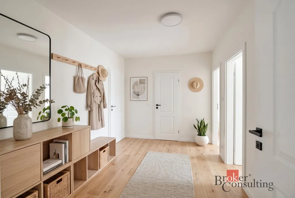 Po vstupu do bytu je prostorná chodba, ze které se dostaneme do všech místností. Je opravdu velkorysá, takže při případné rekonstrukci nabízí zajímavý potenciál pro lepší rozložení, vestavěné úložné řešení nebo otevřenější koncept.