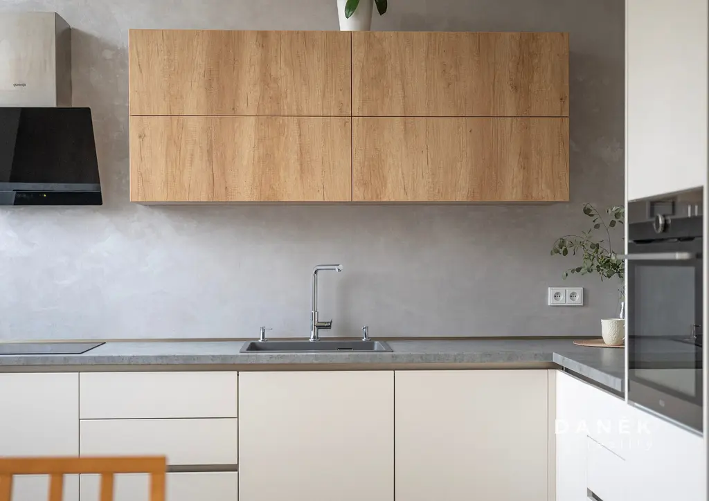 Kuchyňská linka byla vyrobena na míru v moderním bílém matu s elegantní kombinací dřeva a kamenných prvků. Nechybí granitový dřez, indukční sklokeramická deska, myčka nádobí, parní trouba ani digestoř s filtrem (s možností vyvedení ven). Součástí jídelní části je také okno s širokým parapetem – ideální místo na čtení, ranní kávu nebo notebook.