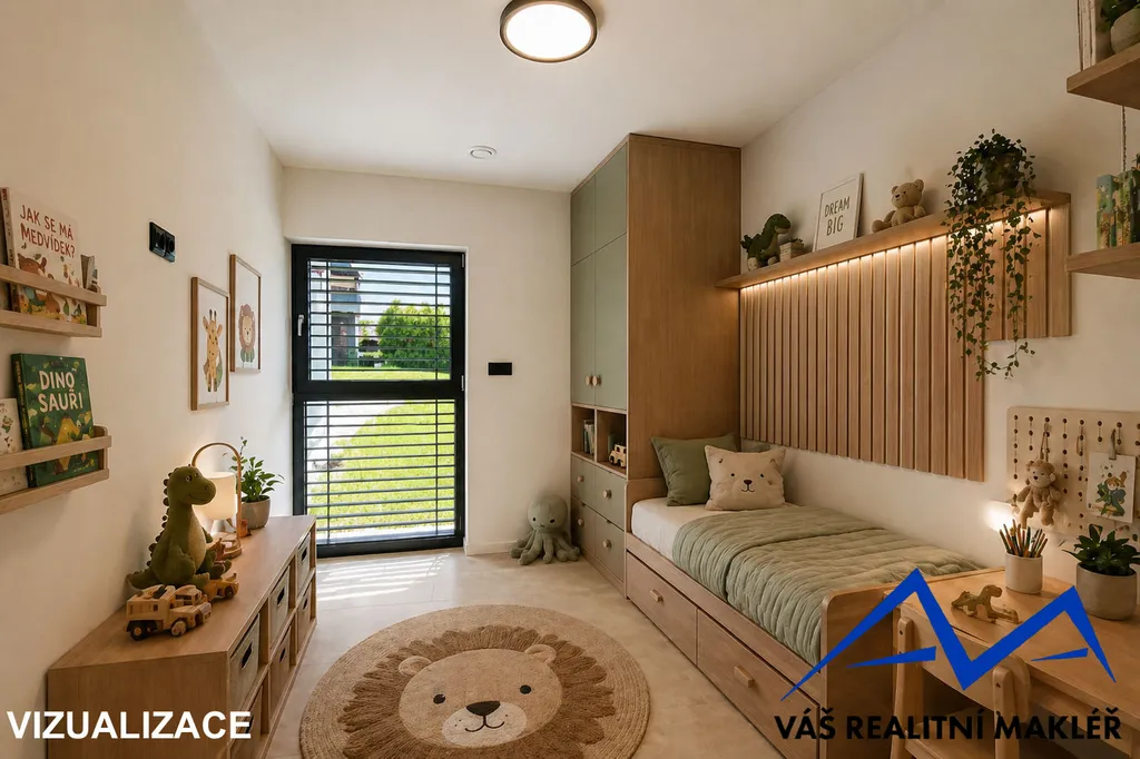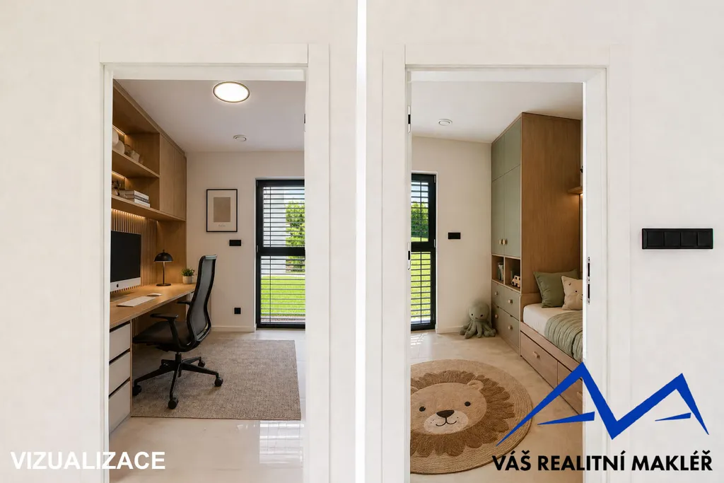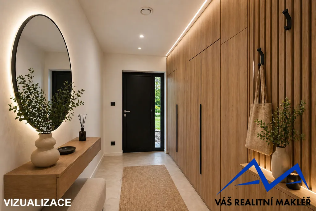 Interiér domu je kompletně dokončen – v ceně jsou podlahy, koupelna se sprchovým koutem i vanou, samostatné WC, interiérové dveře i osvětlení. Kuchyňská linka není součástí, což dává novému majiteli možnost realizace dle vlastních představ.