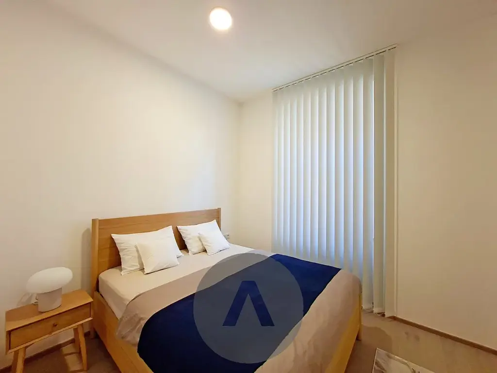 Světlý a prostorný obývací pokoj je vybaven sedací soupravou, konferenčním stolkem, knihovnou, TV stolkem s televizí, polohovatelným pracovním stolem se židlí a jídelním stolem se třemi židlemi. Moderní kuchyně disponuje kuchyňskou linkou s indukční varnou deskou, horkovzdušnou troubou, digestoří, myčkou nádobí, mikrovlnnou troubou a lednicí s mrazicím boxem.