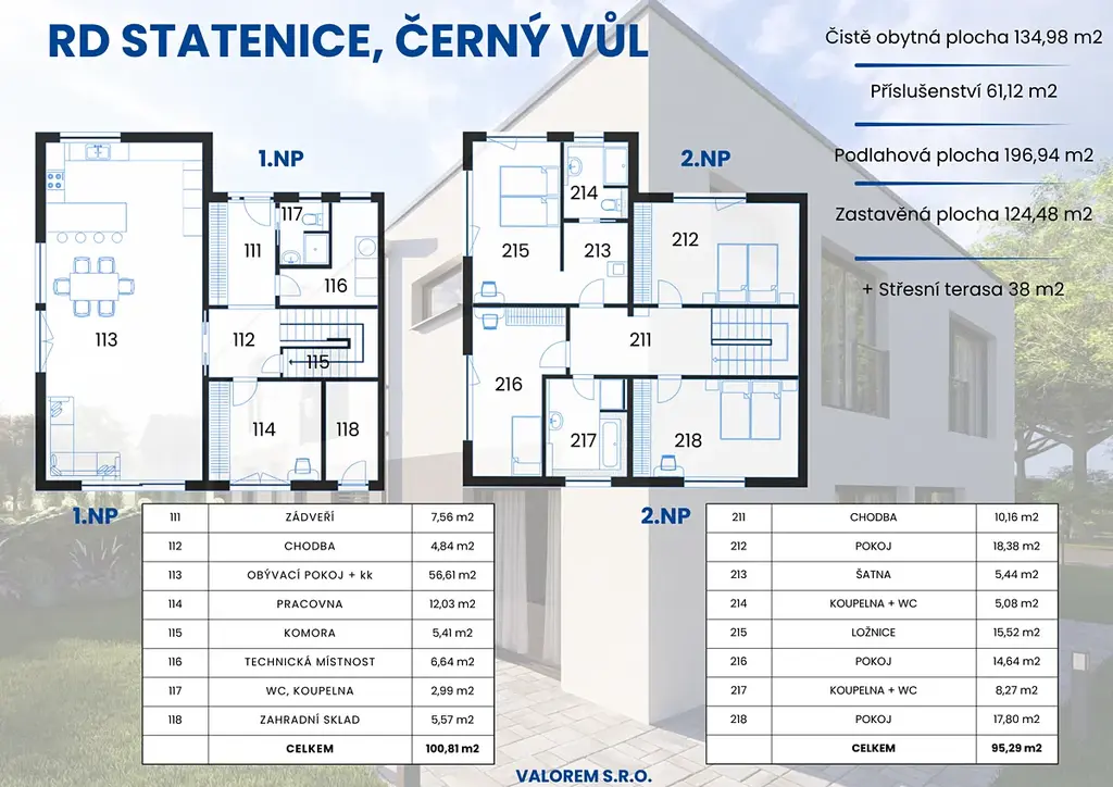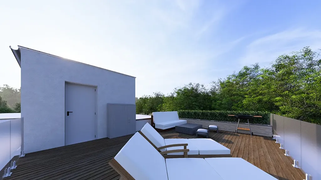 Celková podlahová plocha domu činí 196,94 m² a je doplněna o střešní terasu o velikosti 38 m², která nabízí příjemný prostor pro relaxaci i rodinné posezení. Dispozice domu je prakticky rozdělena do dvou podlaží. V přízemí se nachází vstupní zádveří, chodba, technická místnost, komora, koupelna s WC a samostatná pracovna nebo pokoj pro hosty. Dominantou této části je velkorysý a světlý obývací pokoj s kuchyňským koutem o velikosti 56,61 m², který tvoří přirozené centrum domu a plynule navazuje na venkovní prostor. Součástí přízemí je také praktický zahradní sklad.