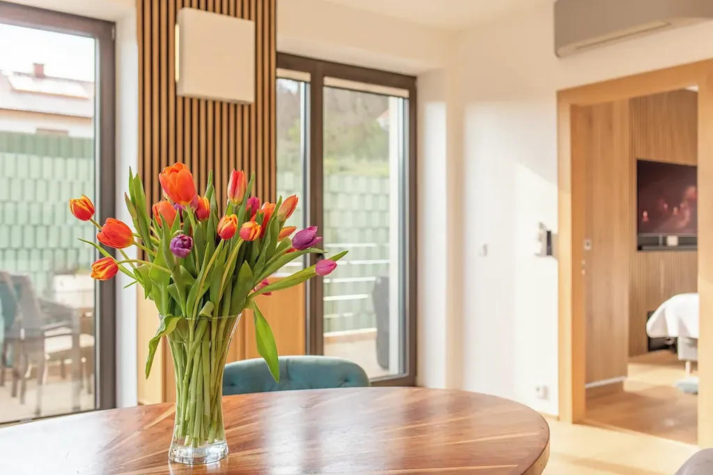Kvalita bez kompromisů: Masivní dřevěné podlahy, trojitá dřevohliníková okna, inteligentní rekuperace Recuair a elektrické venkovní žaluzie.