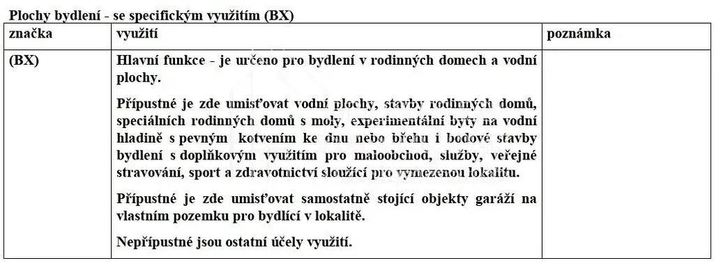 Převážná většina 2 parcel (4084 m2) je v zastavitelném území obce a v územním plánu jsou vedeny jako BX (tedy plochy bydlení se specifickým využitím). Je možná výstavba domu o 2 podlažích + obytném podkroví. Zastavitelnost pozemků je maximálně 30 %, minimální ozelenění pozemku je 60 %. V nezastavitelném území obce je pak menší část 1 parcely (845 m2).