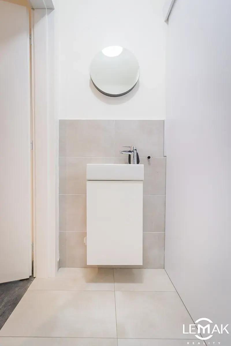 Podlahy v bytě kryje lepený vinyl, v koupelně, komoře a na toaletě keramická dlažba. Vytápění je podlahové, všechny místnosti mají svůj termostat. Byt má rovněž klimatizaci, kterou je možné si v přechodných obdobích přitápět a letních měsících chladit.