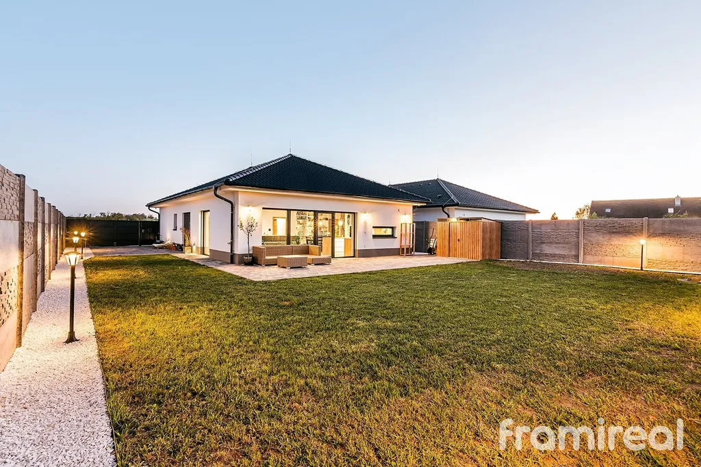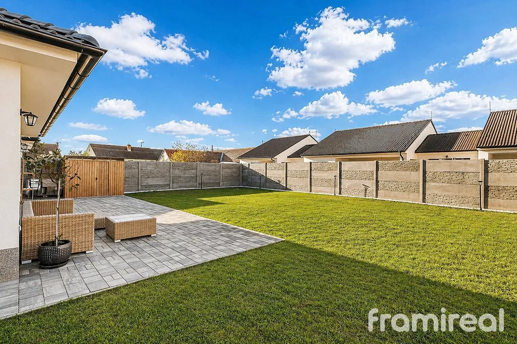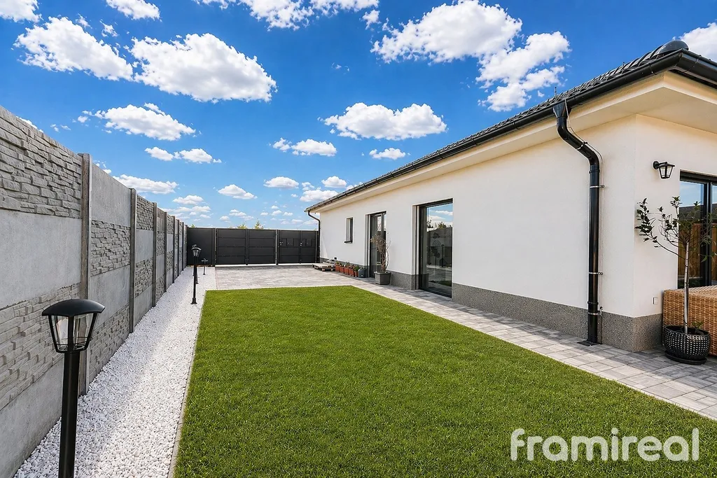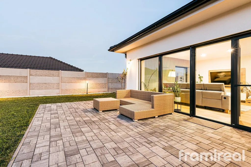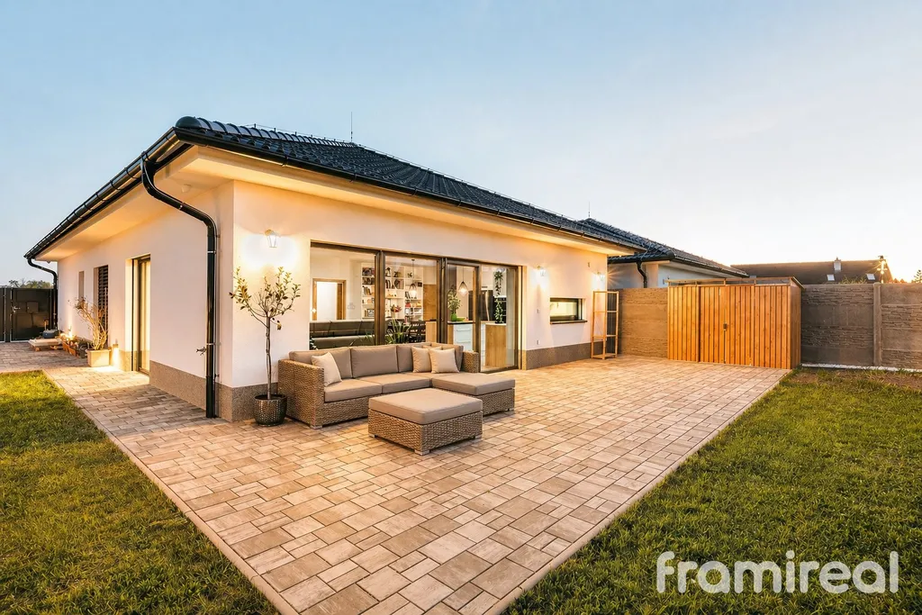 Na pozemku je hotová terasa s venkovním osvětlením, ideální pro večerní posezení. Zahrada je připravena k dokončení podle vlastních představ. Parkování je již vyřešeno – na pozemku je dostatek místa pro více vozů.