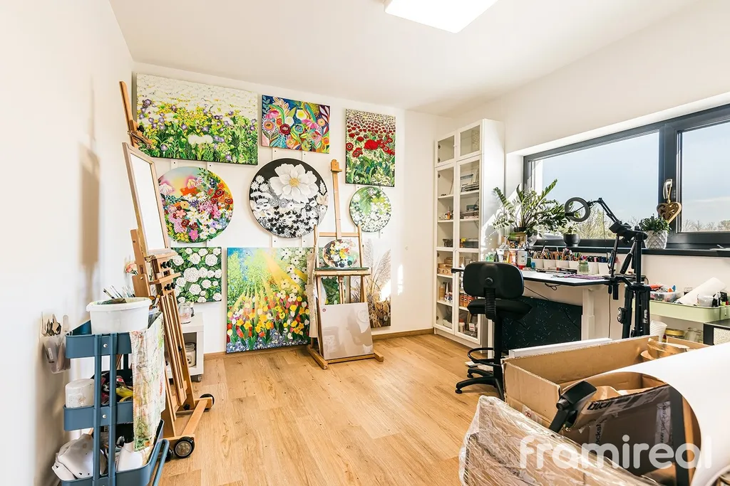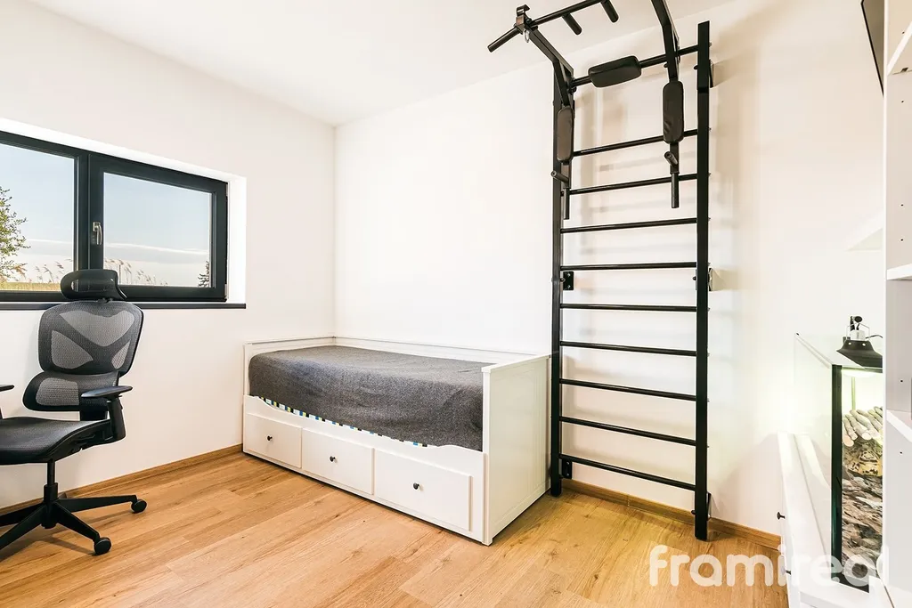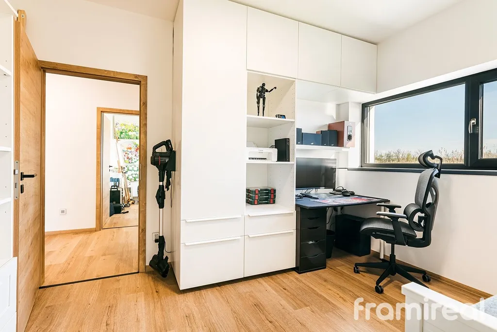 Zateplená půda slouží jako plnohodnotný úložný prostor. Okna s trojskly doplňují elektrické venkovní žaluzie, které pomáhají regulovat teplotu i soukromí v průběhu celého roku. Součástí je také kamerový systém.