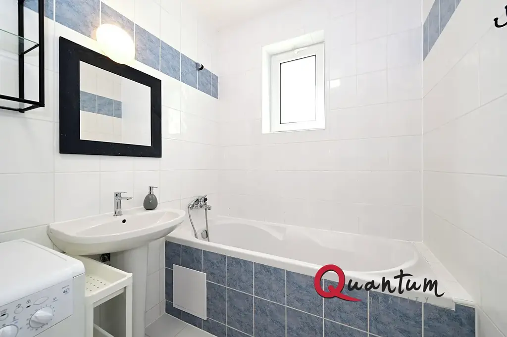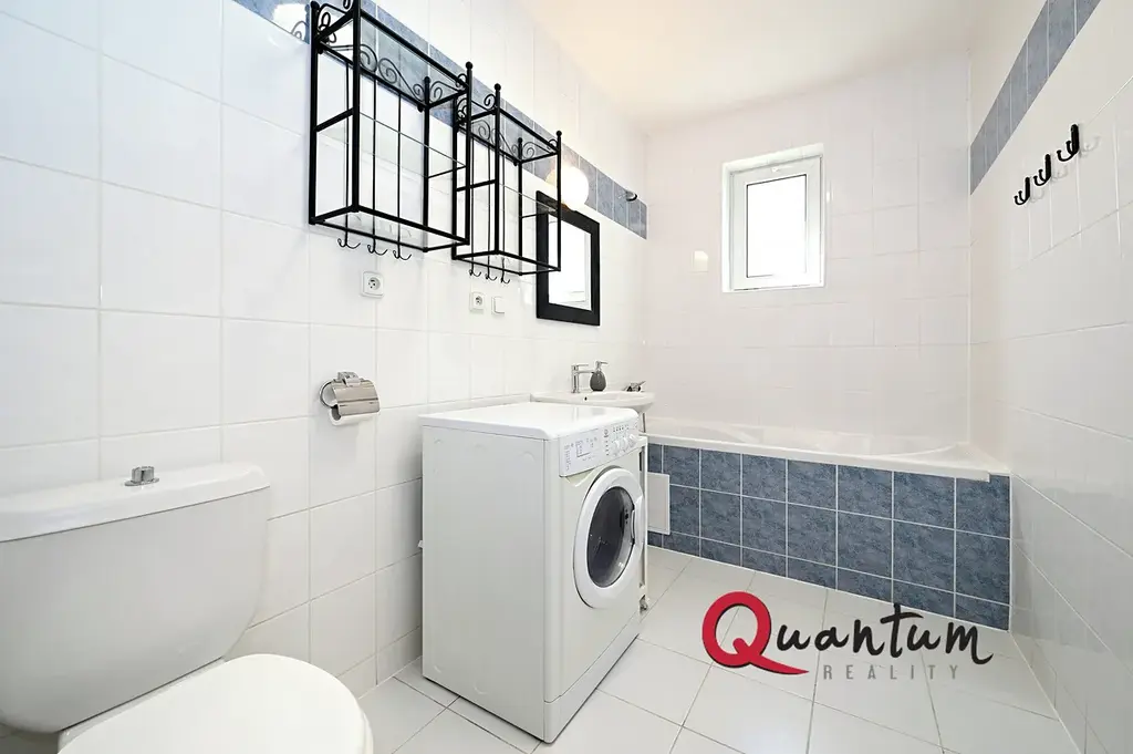Koupelna nabízí vanu, umyvadlo, toaletu a praktickou kombinovanou pračku se sušičkou.