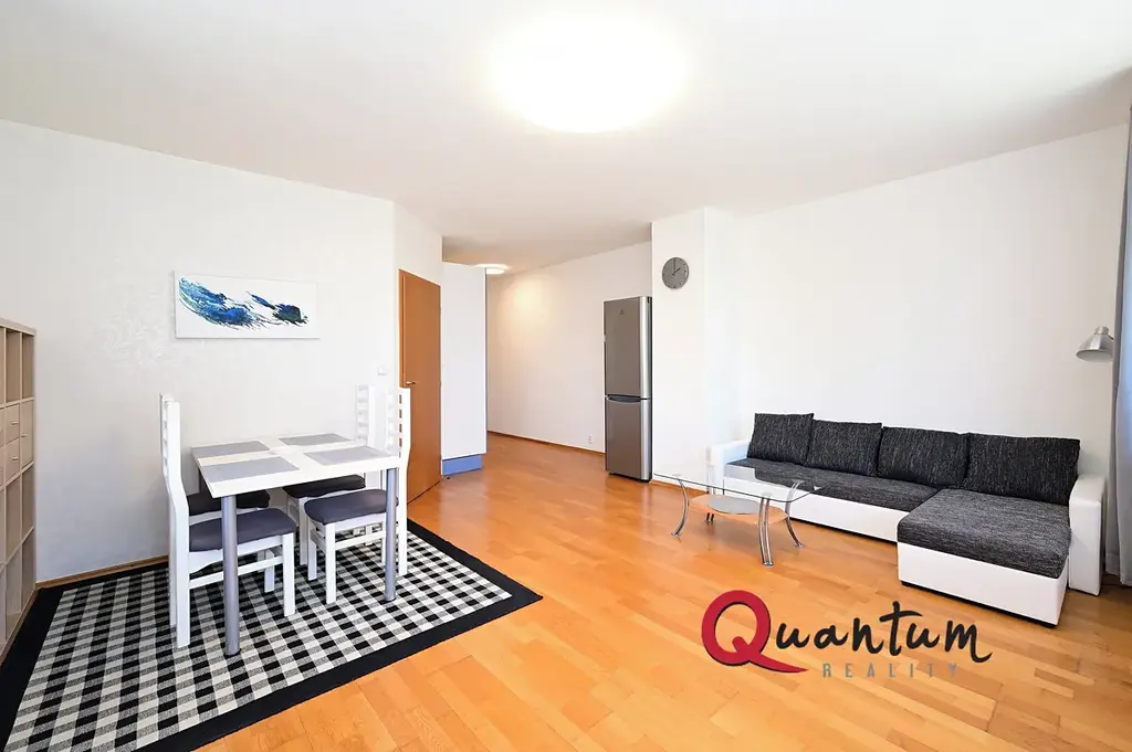 Dispozice bytu tvoří prostorný a velmi světlý obývací pokoj propojený s kuchyňským koutem. Obývací část je vybavena rozkládacím gaučem, jídelním stolem a televizí. Kuchyňský kout disponuje troubou, sklokeramickou varnou deskou, digestoří a lednicí, takže poskytuje vše potřebné pro pohodlné každodenní vaření.