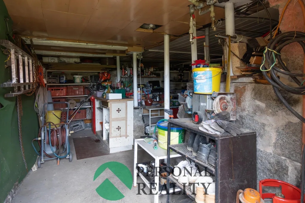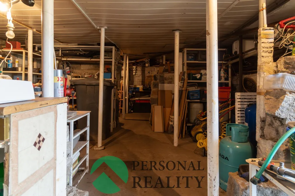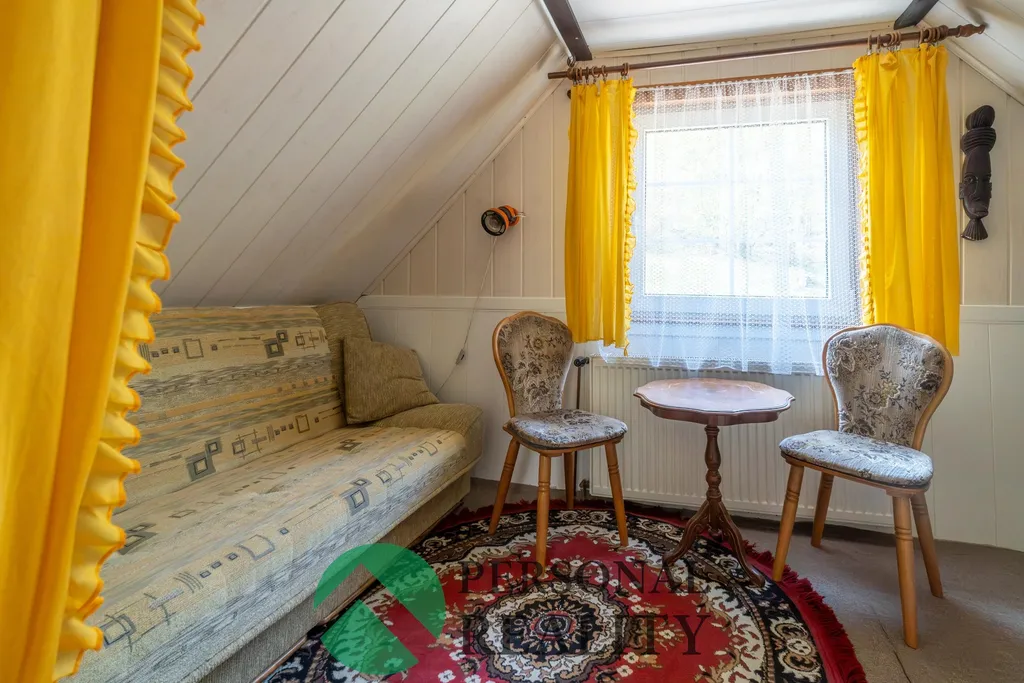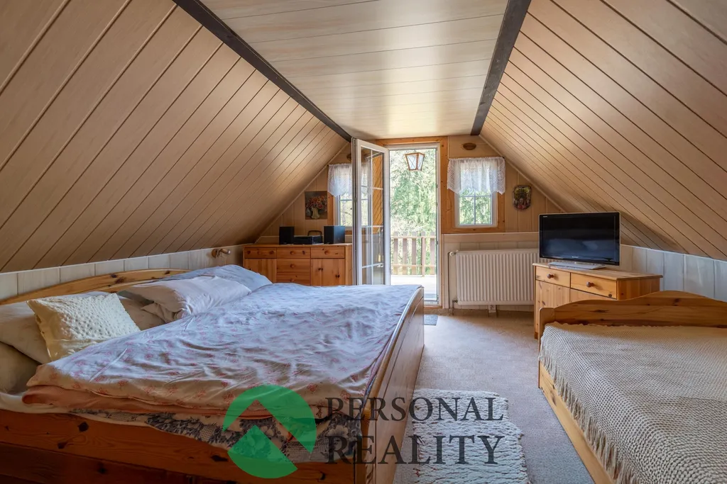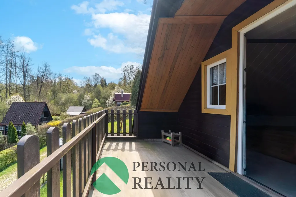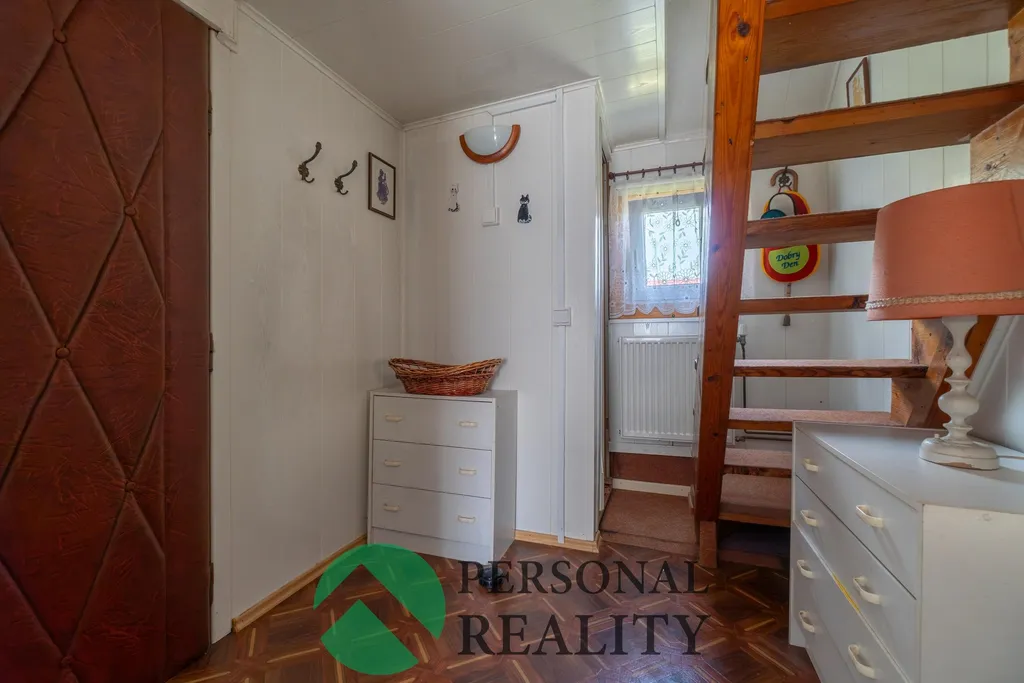 Chata je kompletně podsklepená, což poskytuje dostatek úložného prostoru i praktické technické zázemí. V přízemí vás přivítá vstupní chodba se schodištěm, ze které je přístup do samostatného WC a koupelny s vanou a přípojkou na pračku. Dominantou přízemí je útulný obývací pokoj propojený se světlou kuchyní a jídelním koutem. V patře najdete příjemný odpočinkový prostor nad schodištěm s gaučem, vhodný jako čtecí koutek či místo pro hosty, a samostatnou ložnici se vstupem na prostorný balkon s výhledem do zeleně. Chata se prodává včetně většiny nábytku a ostatního zařízení.