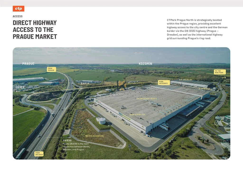CTPark Prague North, špičkové obchodní centrum určené pro moderní podniky. Toto multifunkční obchodní centrum spojuje logistiku, skladování, výrobu, maloobchod, showroomy, kanceláře a další, vše na jednom místě. CTPark Prague North se nachází v bezprostřední blízkosti Prahy, má vynikající napojení na veřejnou dopravu a přímý přístup na dálnici D8, čímž spojuje městskou dostupnost s výhodami regionální polohy. Díky své centrální poloze v Evropě se v dosahu pěti hodin jízdy autem nachází téměř 60 milionů lidí, včetně klíčových trhů, jako jsou Německo a Rakousko.