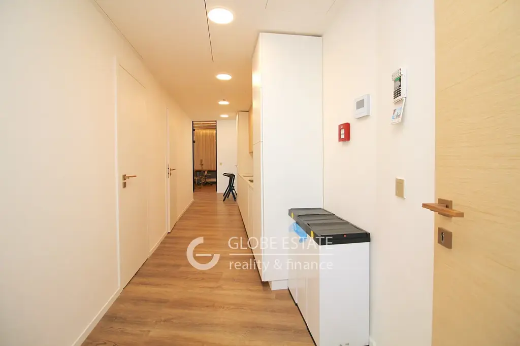 Interiér je navržen s ohledem na maximální efektivitu a komfort. Naleznete zde samostatnou kancelář pro soustředěnou práci, prostorný open space, který podporuje týmovou spolupráci, plně vybavenou koupelnu s toaletou, samostatnou toaletu pro hosty s vestavěnou skříní a pračkou, praktický kuchyňský kout a vestavěnou skříň na chodbě pro dostatek úložného prostoru.
