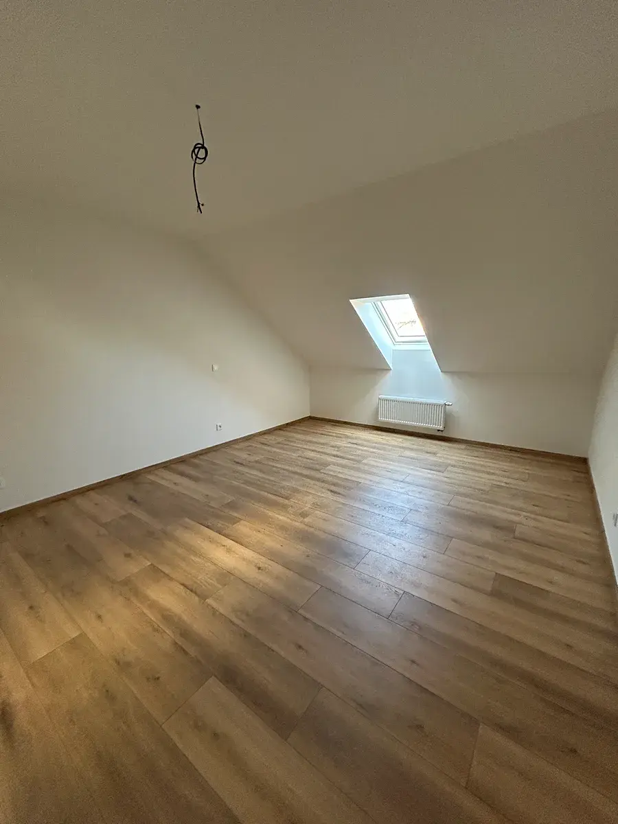Byt je přístupný přes menší zádveří, ze kterého vedou schody do prostorného a světlého podkroví o velikosti 53 m². Dominantou hlavní obytné místnosti jsou přiznané stropní krovy, které dodávají prostoru jedinečný charakter. Součástí je kuchyňská linka s ostrůvkem, vybavená digestoří, troubou, varnou deskou, lednicí a mikrovlnnou troubou (myčka není k dispozici).