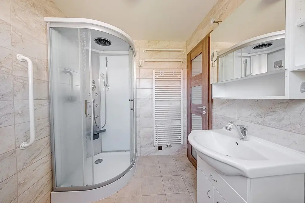 Standardy: vinylové podlahy, plastová okna s izolačním dvojsklem a žaluziemi, dýhované interiérové dveře v obložkových zárubních, nové rozvody, obklady i sanitární vybavení.