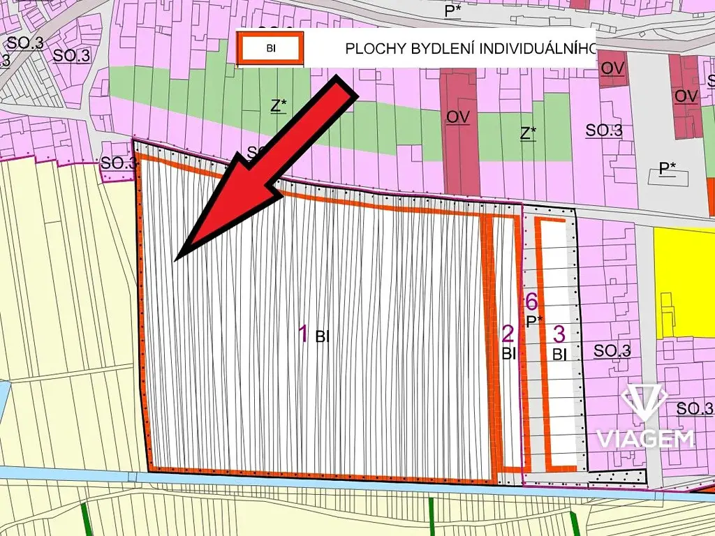 Územní plán: Návrh na bydlení v rodinných domech (BI)