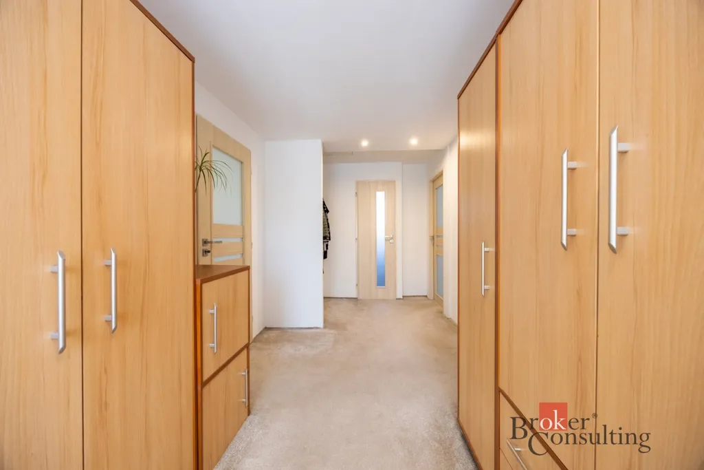 V patře se nachází klidová zóna domu. Je zde chodba s pracovním koutem ideálním pro home office, dále prostorná šatna, druhá koupelna s WC, komfortní ložnice a světlý dětský pokoj.