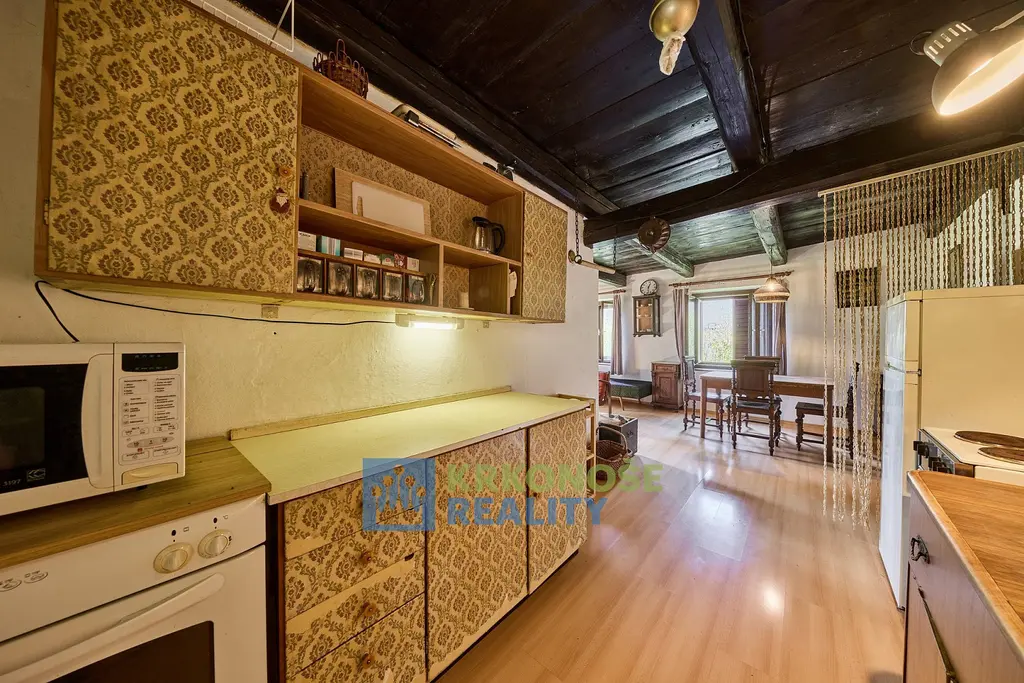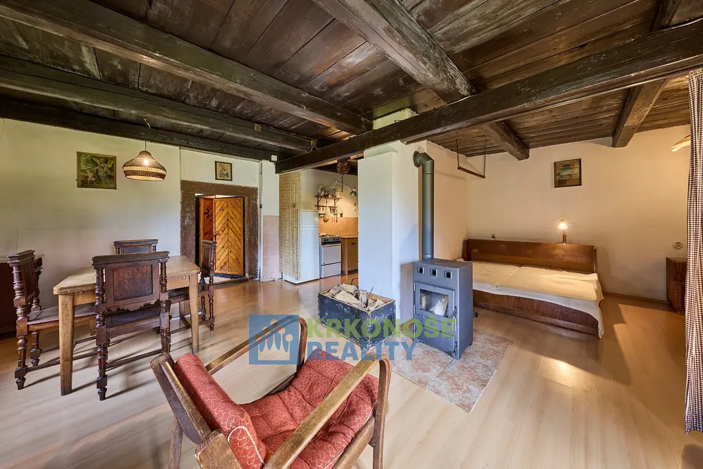 Útulná světnice s krbovými kamny na dřevo, tradičně pojatá kuchyně s původními prvky a spaním pro 4 osoby. Najdete zde i kompletní zázemí (koupelna se sprchou, splachovací WC).