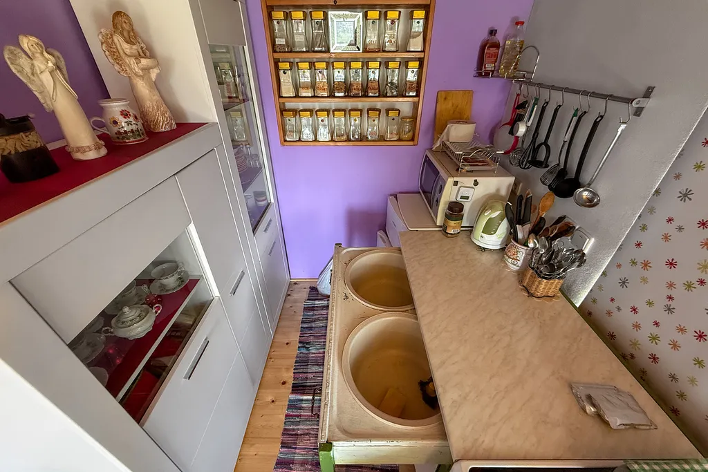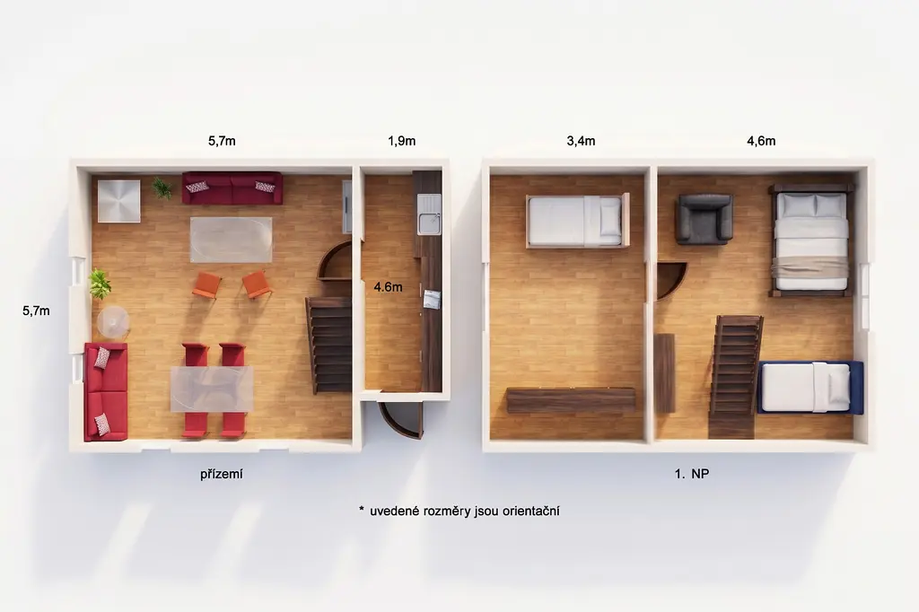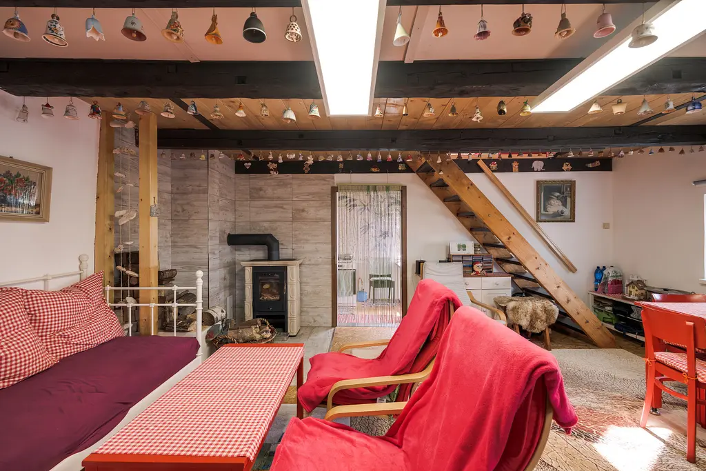 V přízemí se nachází kuchyňský kout s elektrickým sporákem a útulný obývací prostor s kamny na dřevo, která dokážou vytopit celý objekt a díky své akumulaci udrží teplo celou noc. V podkroví se pak pohodlně vyspí celá rodina.
