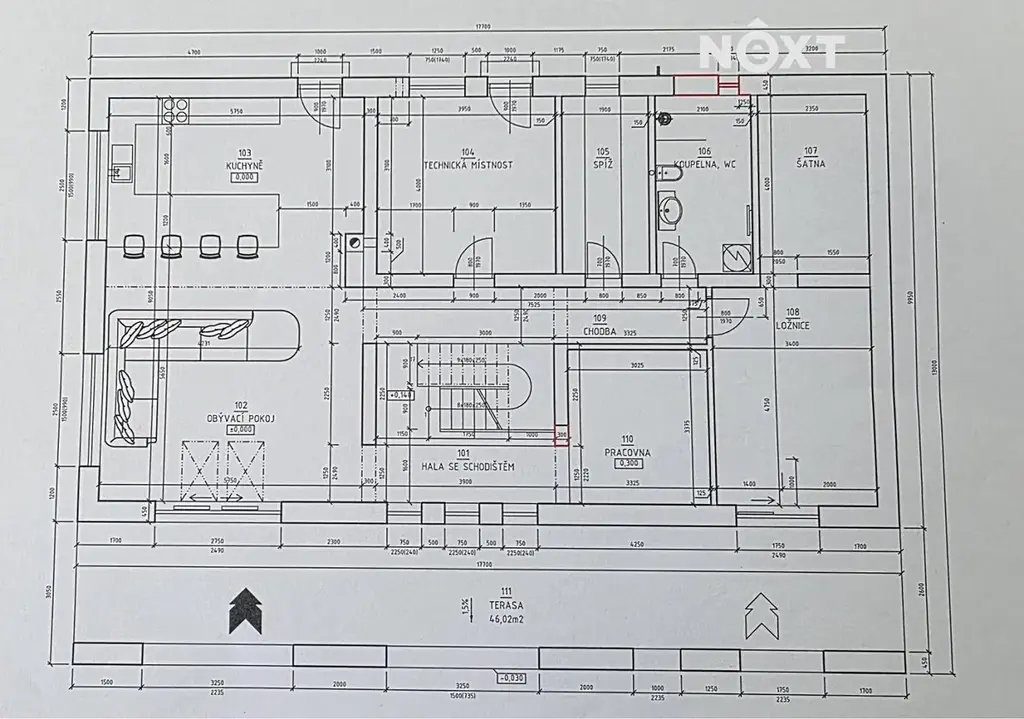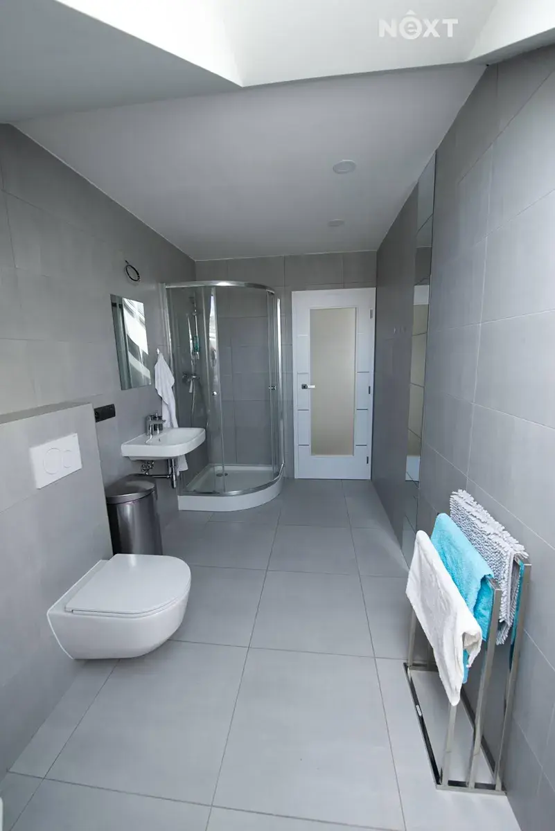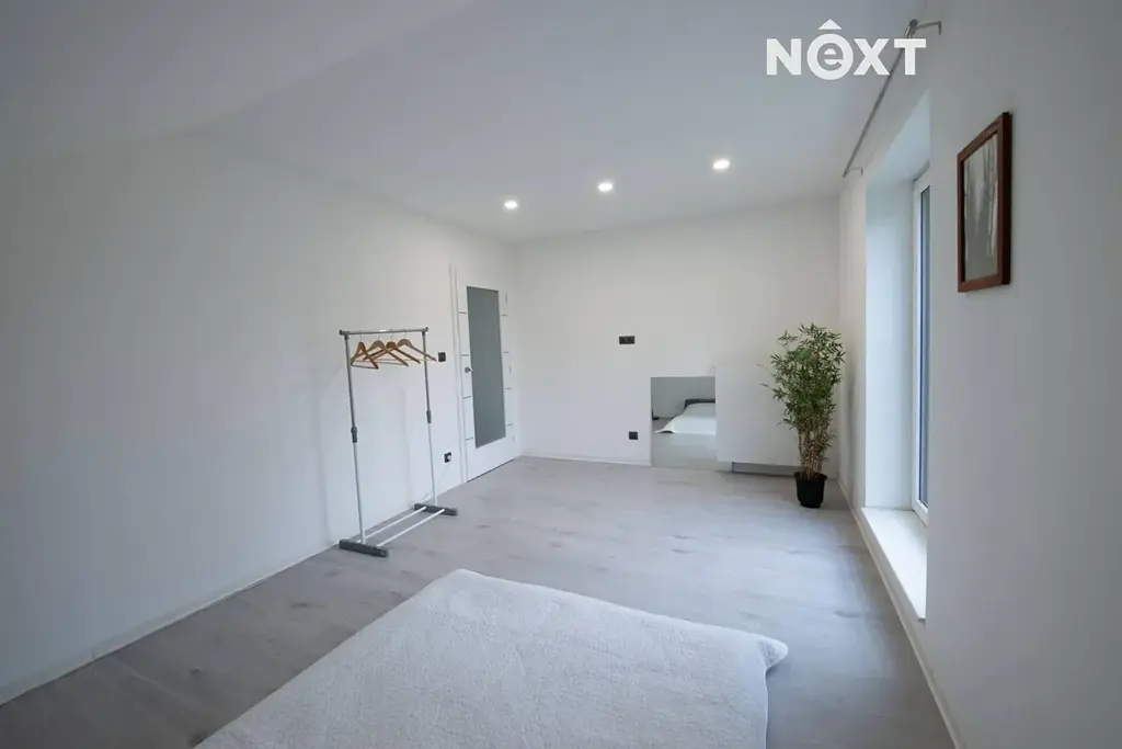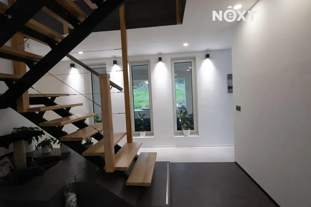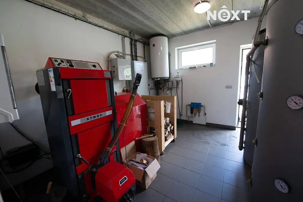 Vpravo od schodiště se nachází chodba vedoucí do otevřené pracovny s dostatkem zásuvek pro IT vybavení. Na levé straně je technická místnost s kombinovaným kotlem na dřevo a pelety (ATMOS), doplněná o dvě akumulační nádrže o objemu 2 m³. Tato místnost má navíc samostatný vstup z exteriéru. Dále zde najdete prostornou komoru s úložným prostorem, koupelnu a velkou ložnici se vstupem na verandu a do šatny vybavené vestavěnými skříněmi.