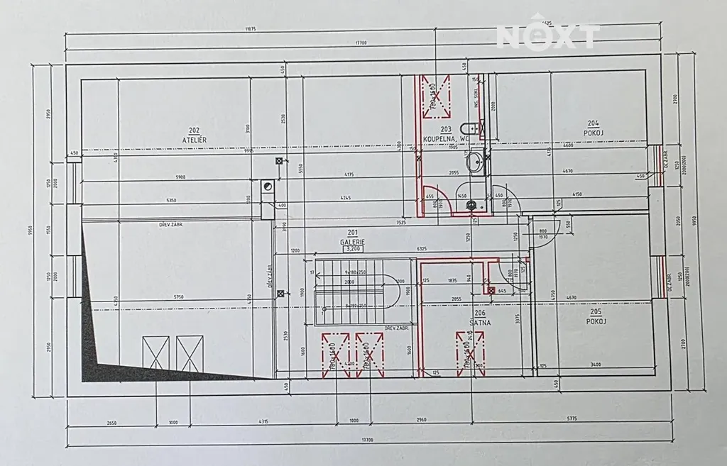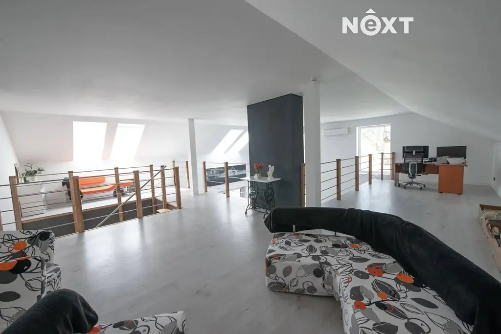 V patře se nachází otevřená galerie, ideální jako knihovna, ateliér nebo herna. Druhá část patra nabízí koupelnu a tři podkrovní pokoje.