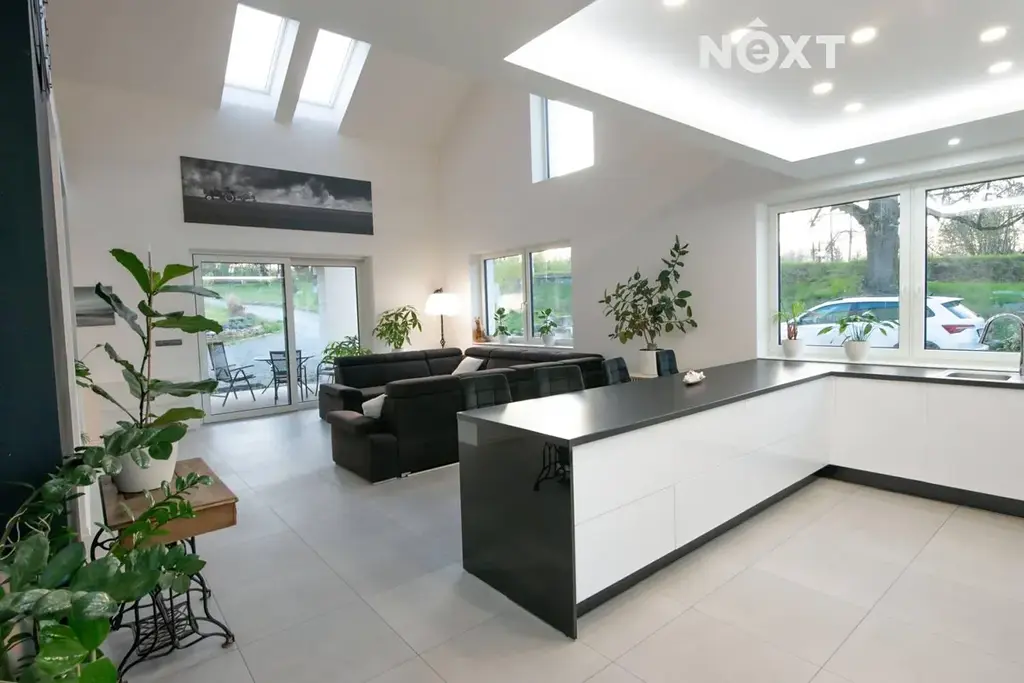 Nabízíme moderní atriový rodinný dům o dispozici 5+kk, jehož promyšlené řešení rozděluje prostor na dvě hlavní části – otevřenou společenskou zónu s galerií a klidovou část s ložnicemi a zázemím.