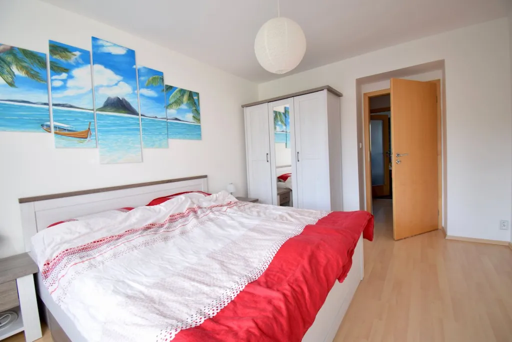 Byt se nabízí plně vybavený a jsou zde dva samostatné neprůchozí pokoje. Kuchyně disponuje lednicí, varnou deskou, troubou, mikrovlnnou troubou, myčkou a jídelním stolem se židlemi. Obývací část je zařízena rohovým gaučem, konferenčním stolem a obývací stěnou. Součástí ložnice je manželská postel, noční stolky, skříň a komoda. Koupelna je spojená s toaletou a nachází se zde vana, umyvadlo, zrcadlo a pračka. Předsíň je vybavena botníkem a skříní. Elektronika na bytě nezůstává.