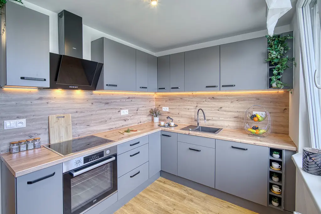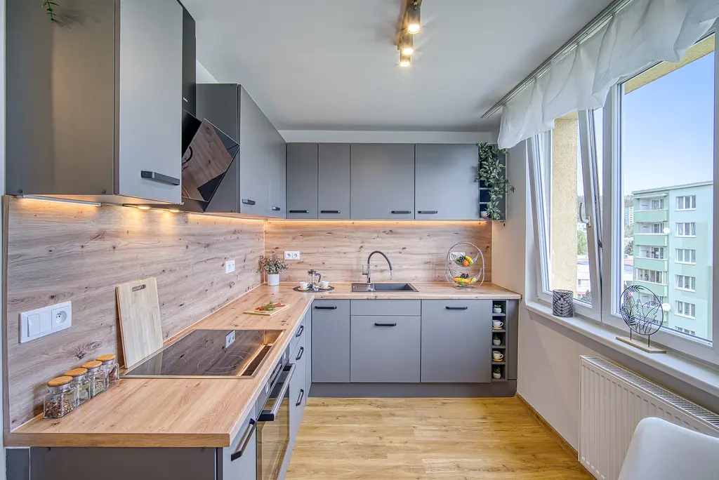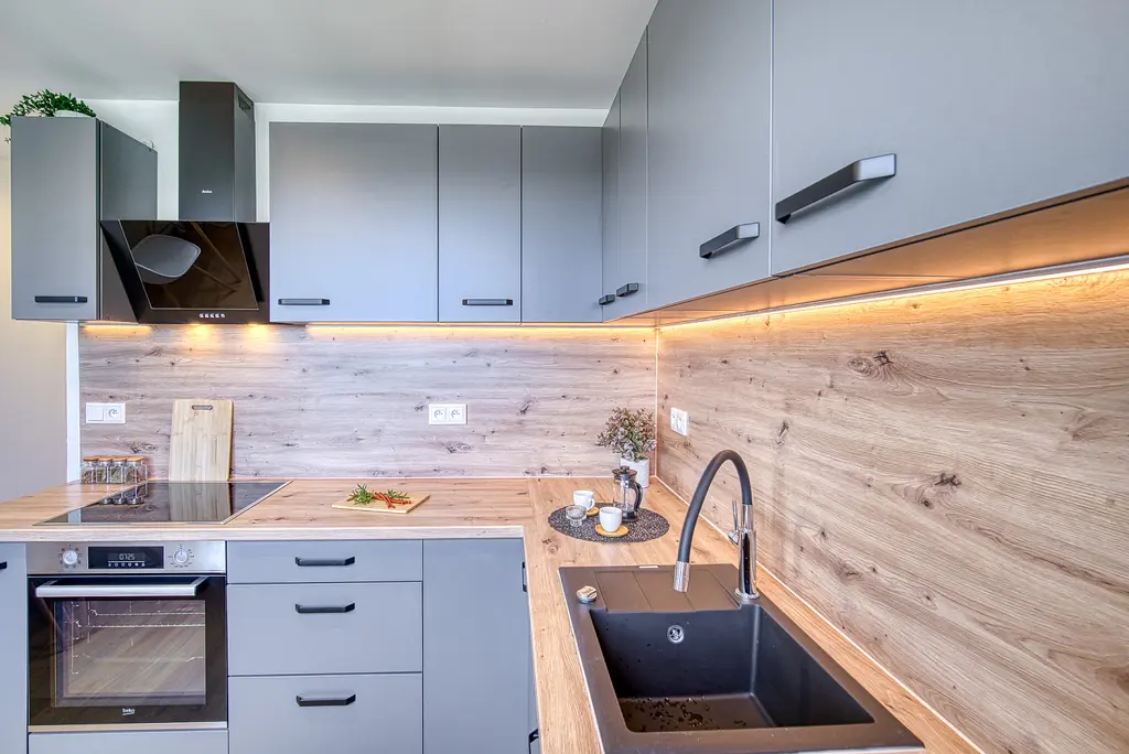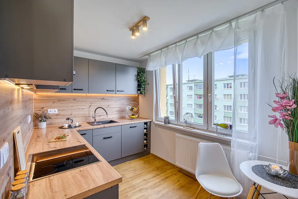Kuchyň je prakticky řešená a vkusně zapadá do bytu. Je vybavena varnou deskou, elektrickou troubou, digestoří a myčkou nádobí, dřezem a baterií.