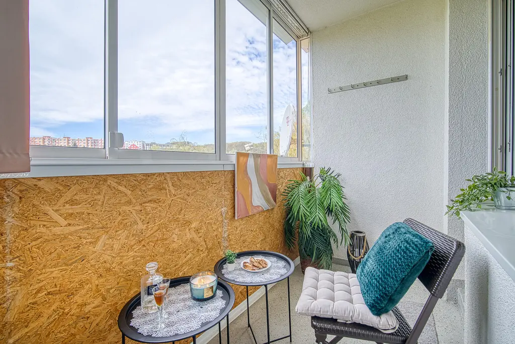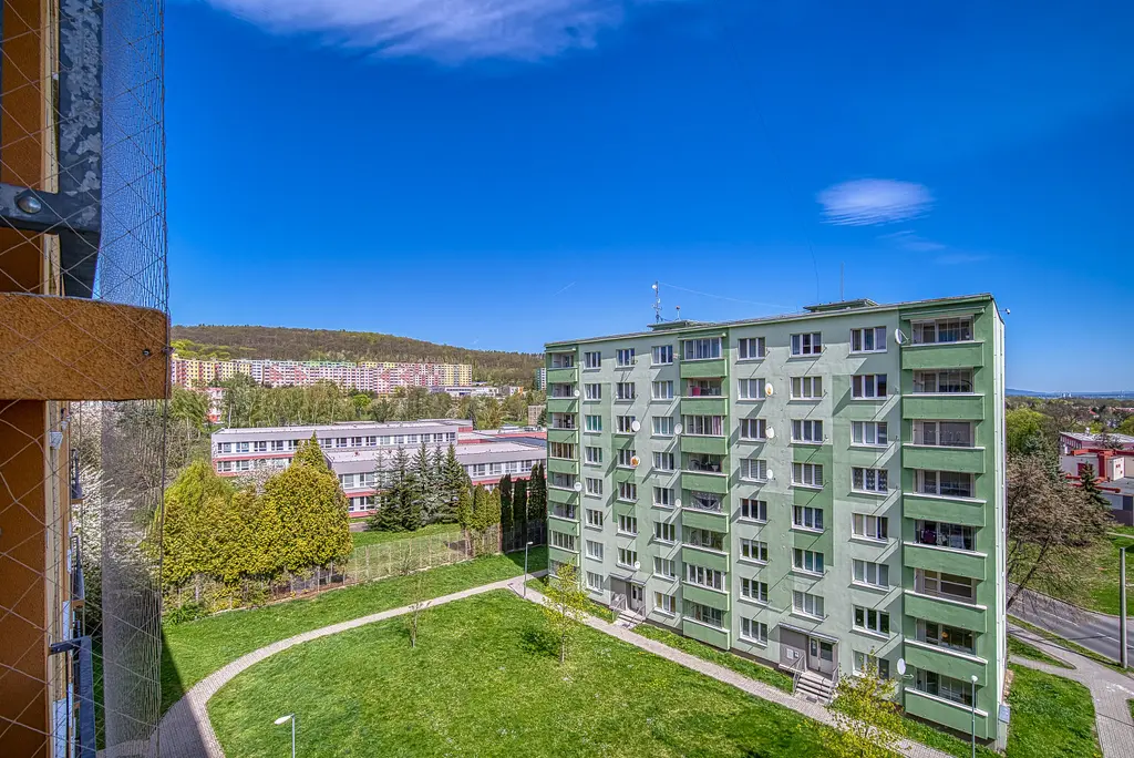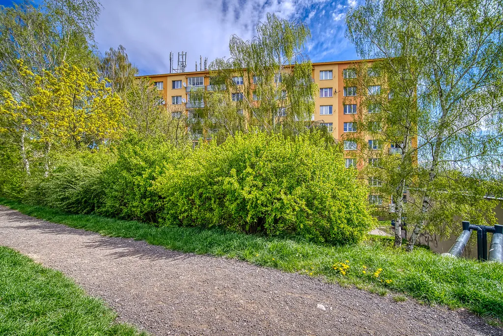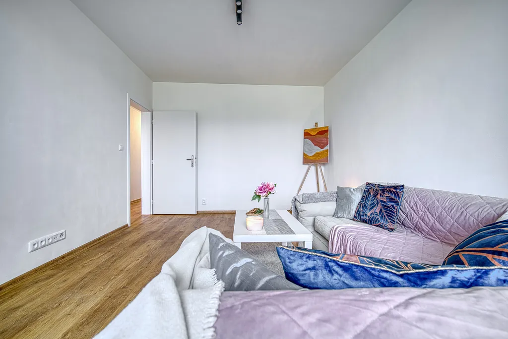 Dominantou bytu je hlavní obytný prostor s plynulým průchodem do lodžie, která má výhled do zeleně. Sousedící pokoj může sloužit jako ložnice, která je umístěna taktéž do klidné části okolí.