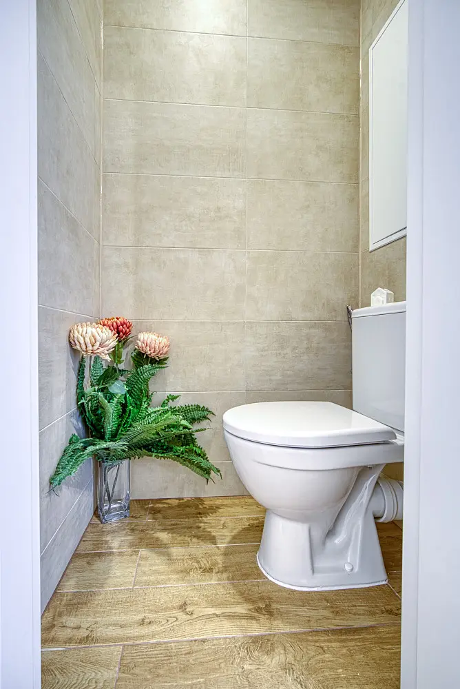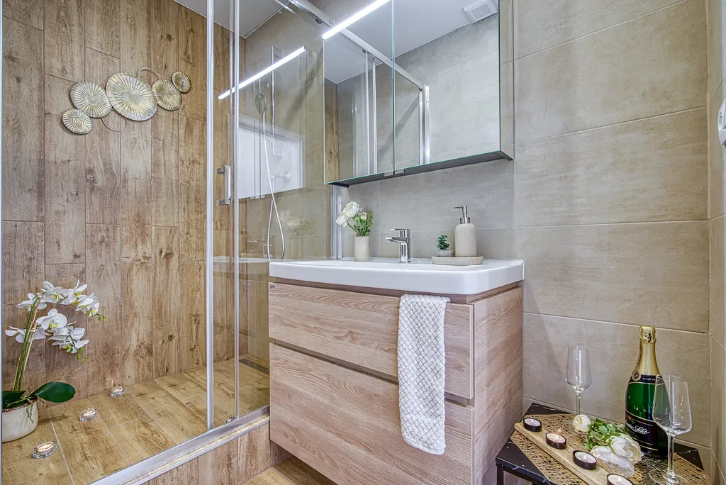 V koupelně je umístěn sprchový kout, umyvadlo s koupelnovými skříňkami, zrcadlo se skříňkou a příprava na připojení pračky. Součástí je i samotná místnost s toaletou.