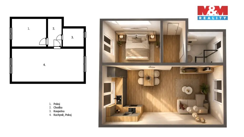 Nabízíme k prodeji moderní byt 2+kk o užitné ploše 43 m², který vznikl v rámci kompletní rekonstrukce rodinného domu v obci Kožušany-Tážaly. Při rekonstrukci byl kladen důraz na kvalitu použitých materiálů i současné standardy bydlení. Byt se nachází v 1. patře a nabízí promyšlenou dispozici: obývací pokoj s kuchyňským koutem a jídelnou, samostatnou ložnici a koupelnu se sprchovým koutem. Samozřejmostí je podlahové vytápění, vinylové podlahy a klimatizace. Výhodou je půdní prostor s přivedenými sítěmi, který nabízí potenciál pro rozšíření o další místnosti. Ve dvoře najedete prostor k vlastnímu odpočinku a relaxaci. Dále je zde i sklep a prostor pro kola a kočárky. Dům je vybaven kamerovým systémem a domovním zvonkem. Součástí bytu bude kuchyňská linka. Upozorňujeme, že přiložené fotografie jsou vizualizační. Dokončení bytu je plánováno nejpozději na srpen 2026, což umožňuje dostatek času k možnosti úprav dle vlastních představ. V případě zájmu o prohlídku nás neváhejte kontaktovat.