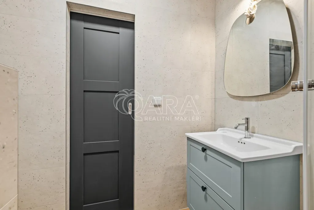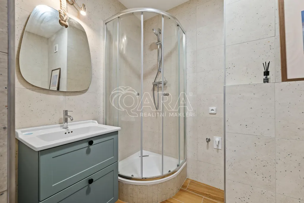 Koupelna je moderně zařízena, najdete zde sprchový kout, umyvadlo se skříňkou a přípojkou na pračku. Vytápění je zajištěno centrálním dálkovým topením a dálkovým ohřevem vody, což zajišťuje komfortní a bezstarostné bydlení.
