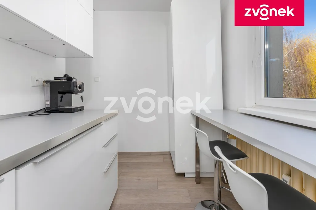 Kuchyně – nová kuchyňská linka v moderním designu s vestavěnými spotřebiči (plynový vařič, trouba, digestoř, myčka, lednice s mrazákem). Příjemným prvkem je barový pult podél okna s elegantními barovými židličkami.