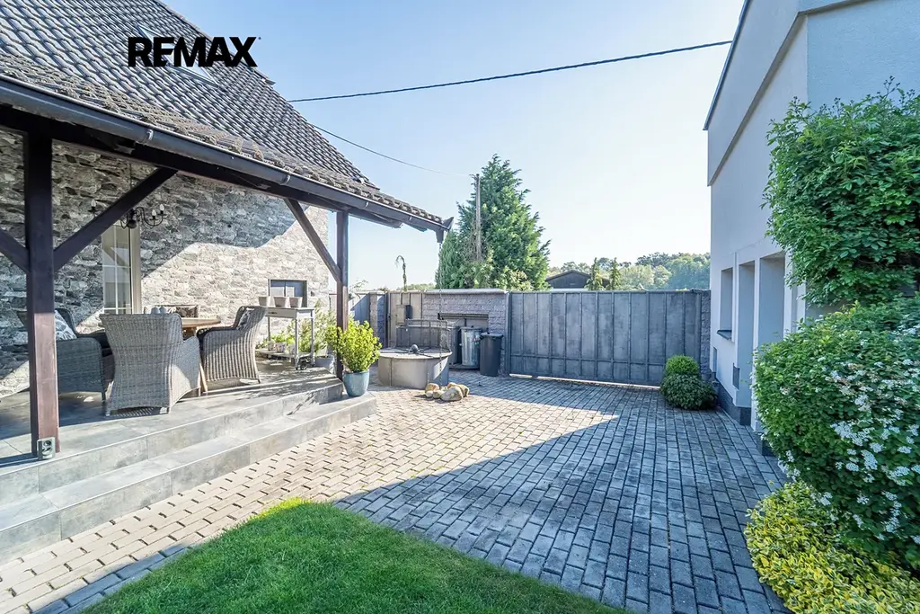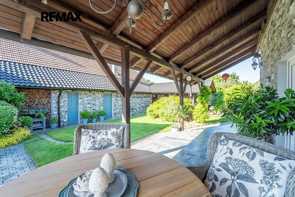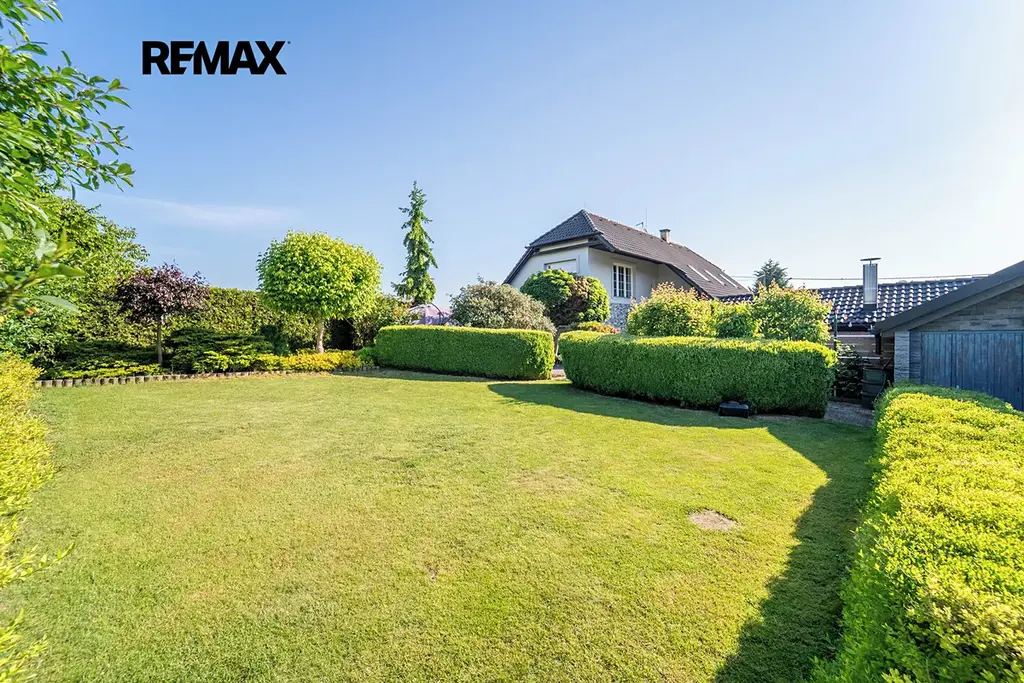 Zahrada nabízí naprosté soukromí a pohodu – je plná okrasných a ovocných stromů, s několika možnostmi posezení – buď na terase, nebo pod zastřešenou pergolou s krbem a grilem. O pravidelnou péči o trávník se stará automatická sekačka a zavlažování.