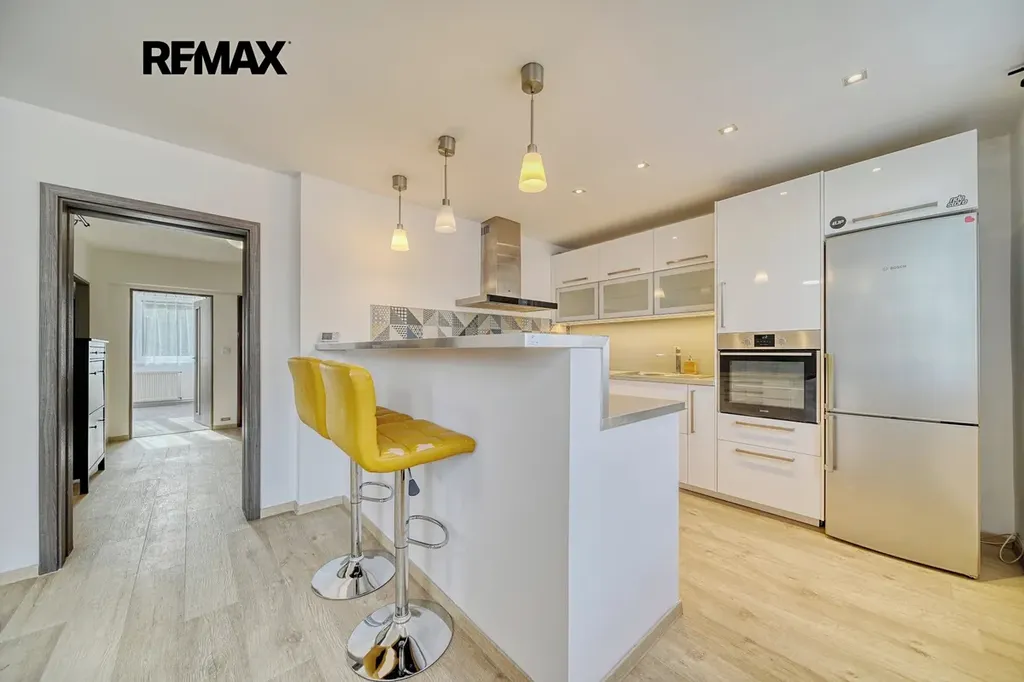 Součástí bytu je udržovaná kuchyňská linka s vestavěnými spotřebiči (lednice, trouba, varná deska, digestoř). Podlahy tvoří kombinace plovoucích podlah, dlažby a koberec. Stropy jsou zateplené a snížené sádrokartonem, což přispívá k vyššímu komfortu bydlení.