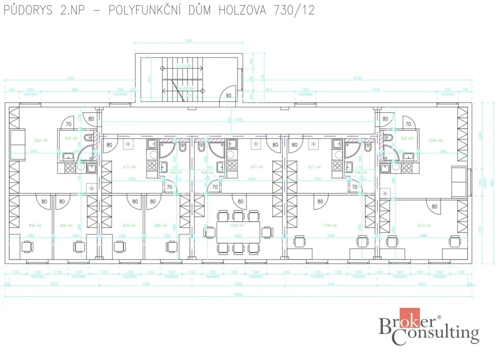 9 kanceláří, které jsou dispozičně řešeny tak, aby mohly sloužit jako byt i kancelář, což umožňuje flexibilní využití