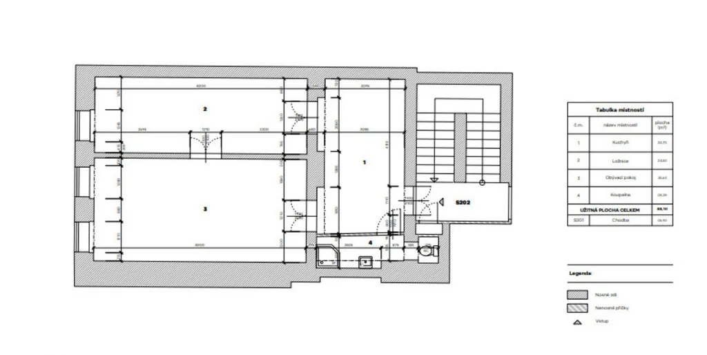 Celková výměra jednotky činí 88,1 m2, dispozice 2+1. Byt je umístěn ve druhém nadzemním podlaží budovy. Jednotka je vybavena novou kuchyňskou linkou se spotřebiči – varná deska, trouba, lednička, myčka.