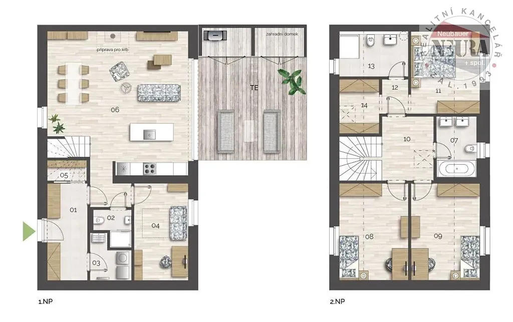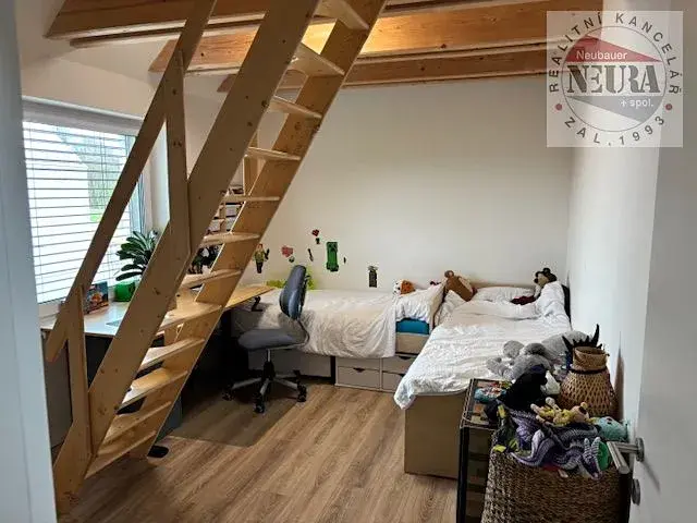 patro: hala, pokoje 2x 14,3 m2 a 12,2 m2, 2x koupelna s WC, šatna,