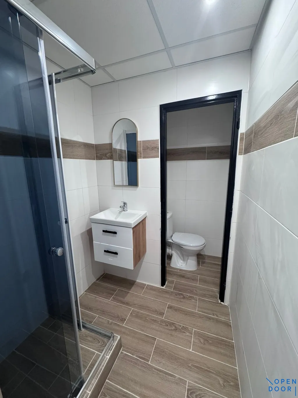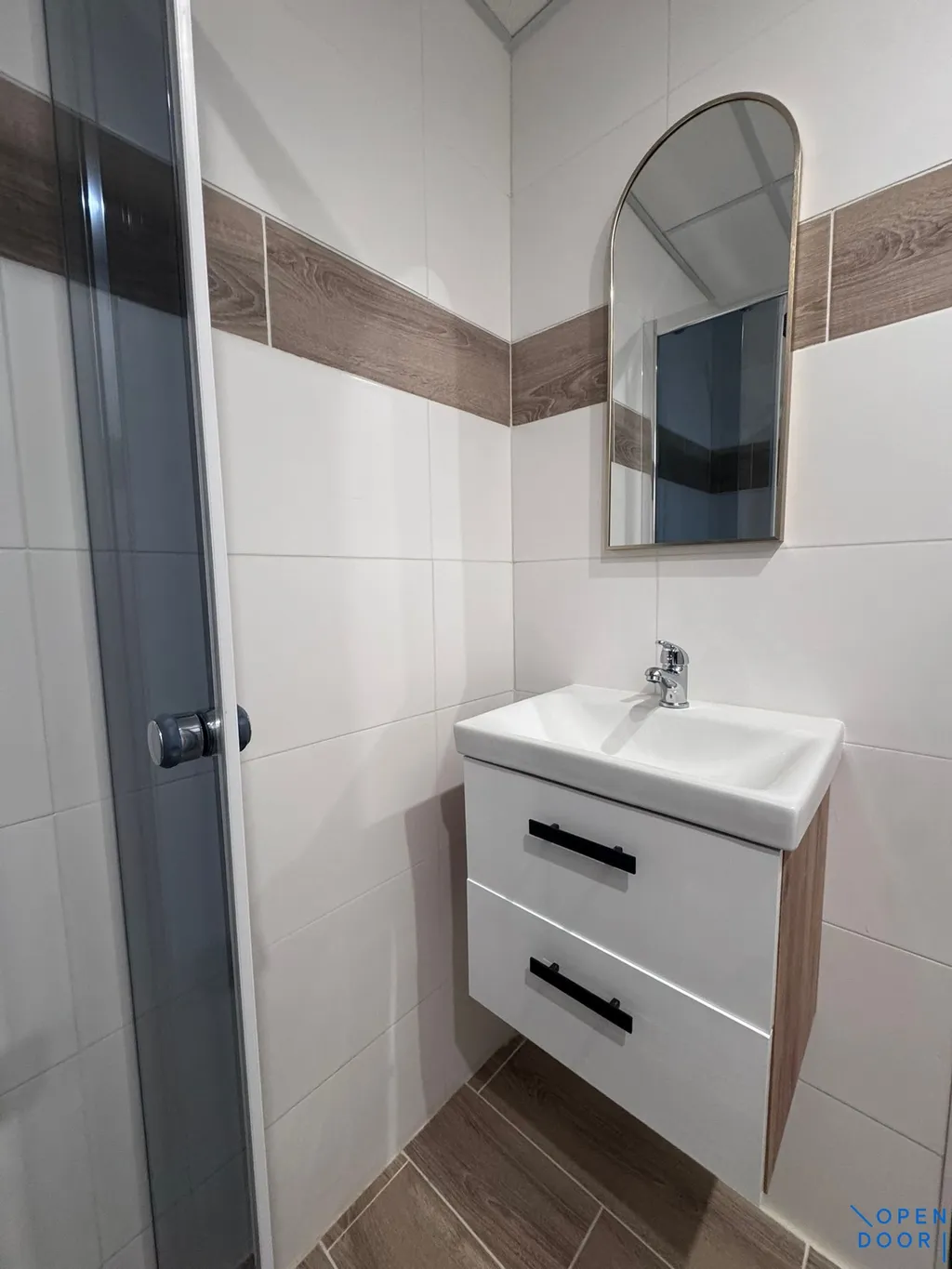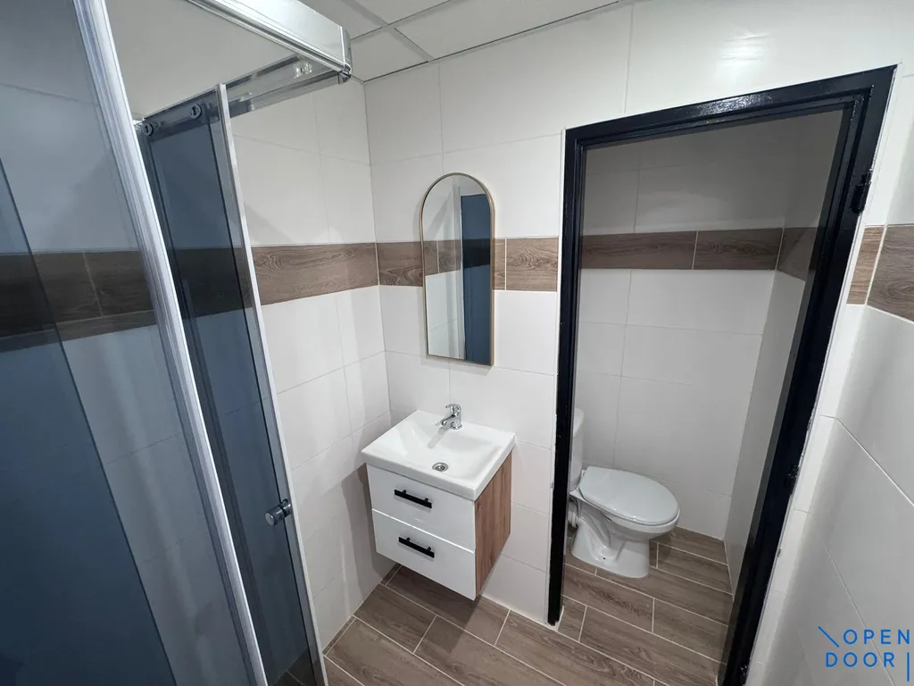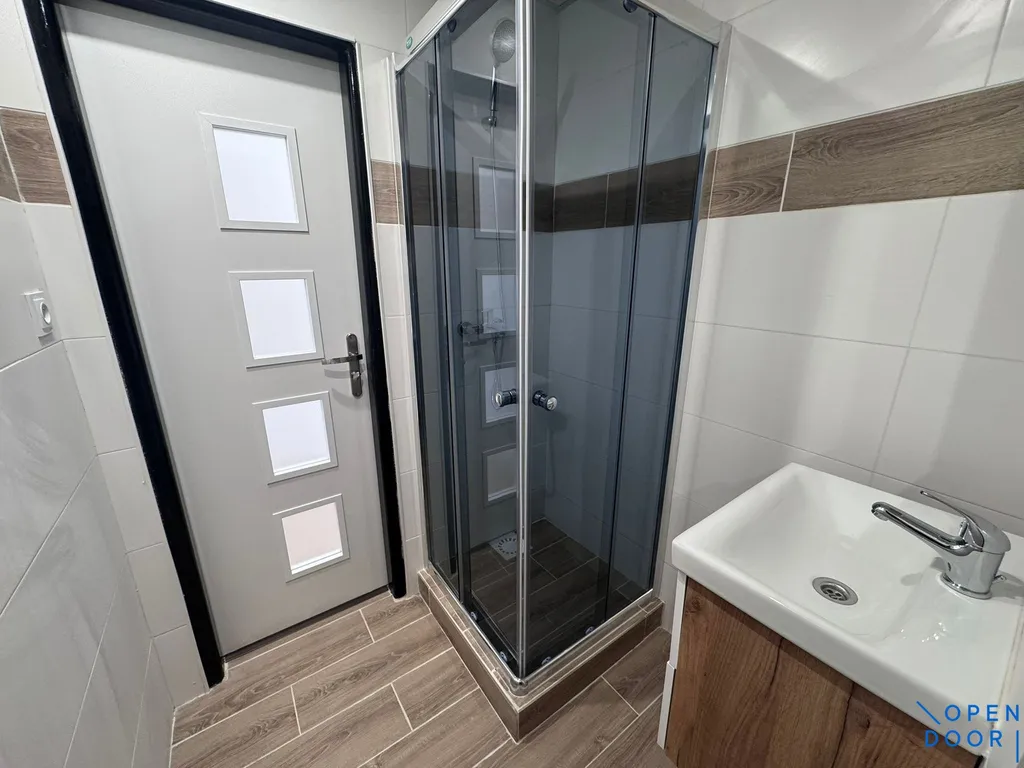 Koupelna je řešena jako moderní celek se sprchovým koutem, skříňkou s umyvadlem a zrcadlem, přičemž toaleta je součástí koupelny.