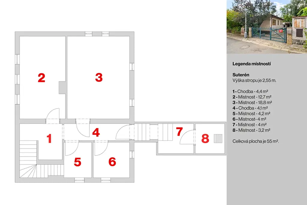 Dům je podsklepen téměř v celé ploše, s dvěma většími místnostmi 18m² + 13m² a dvě menší cca 4m² + 4,5m², v celém 1.PP je výška stropů 255cm.