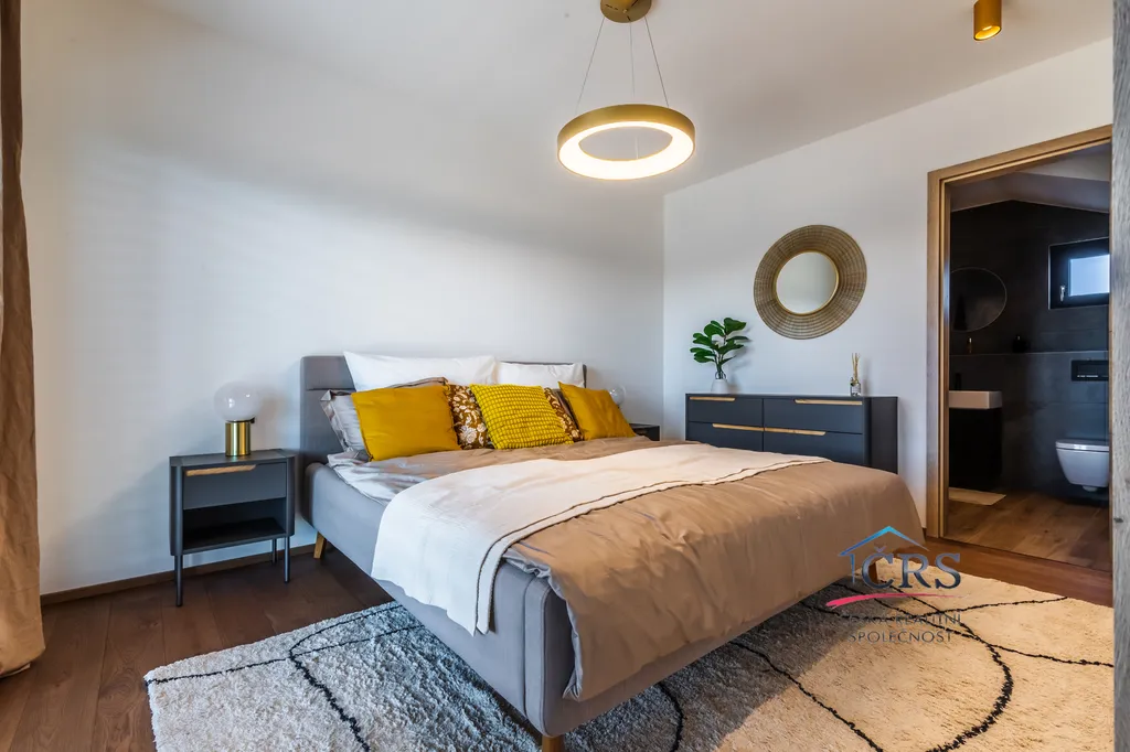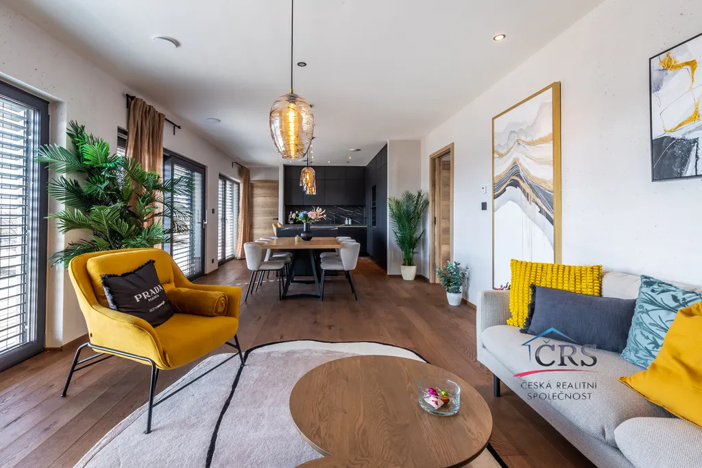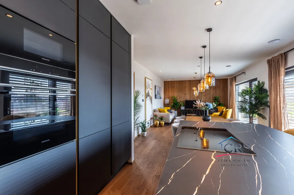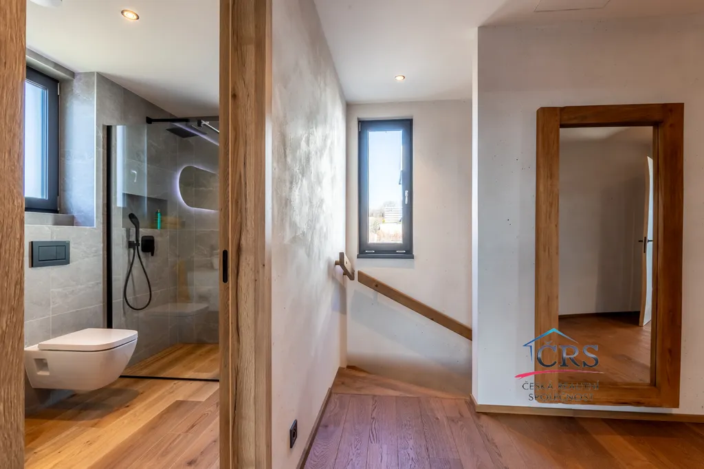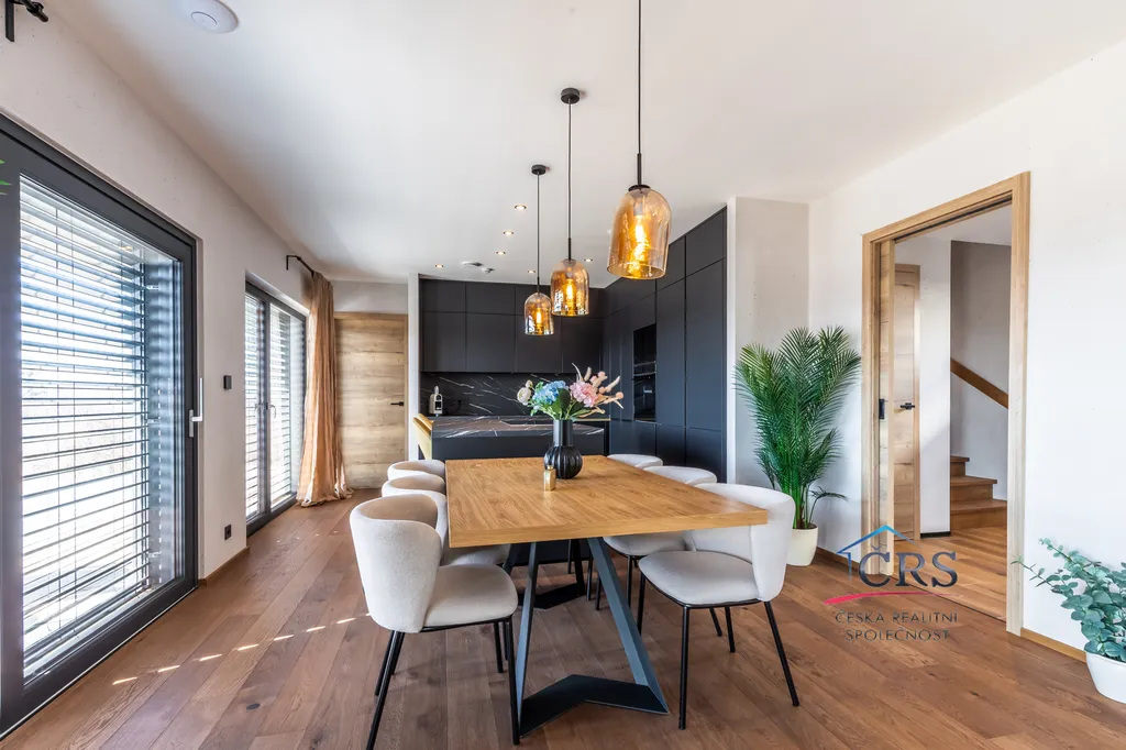 Promyšlená dispozice 5+kk nabízí prostorný, částečně prosklený obývací pokoj s kuchyňským koutem, ze kterého je přímý vstup bezprahovým HS portálem na dřevěnou terasu o velikosti 30 m². Dům disponuje čtyřmi ložnicemi, které zajistí komfortní bydlení i pro větší rodinu. Hlavní ložnice má vlastní koupelnu a prostor pro šatnu. Celkem zde najdete tři koupelny, z nichž dvě jsou součástí ložnic, což zajišťuje maximální pohodlí a soukromí.