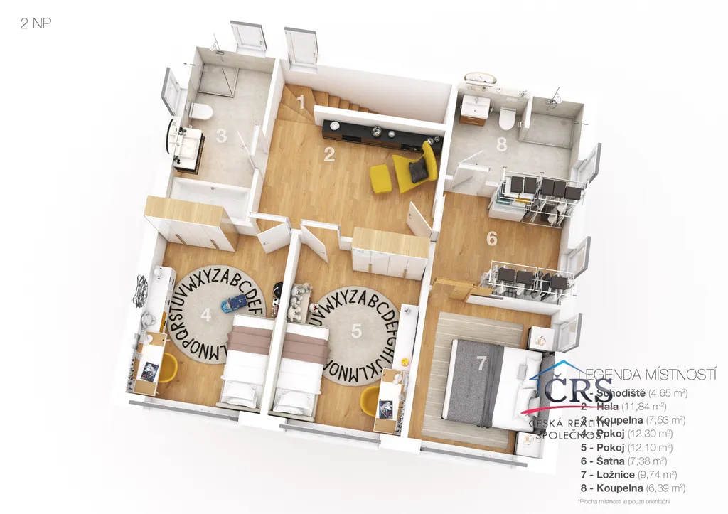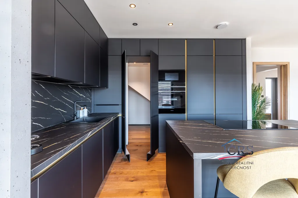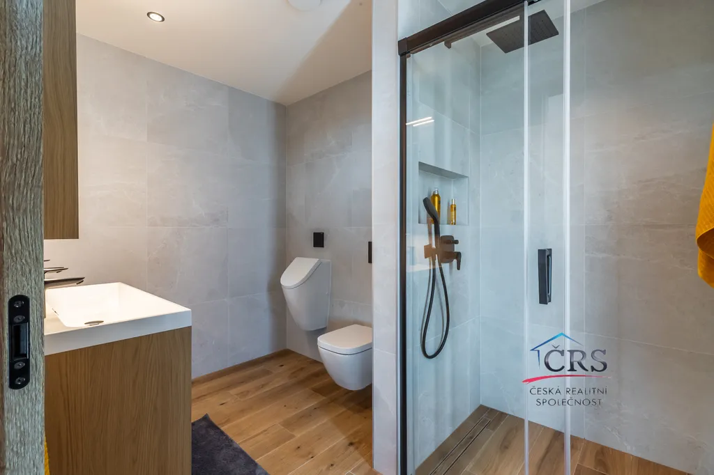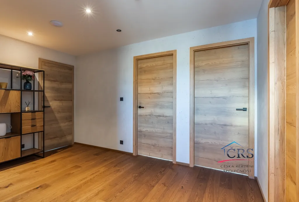 Promyšlená dispozice 5+kk nabízí prostorný, částečně prosklený obývací pokoj s kuchyňským koutem, ze kterého je přímý vstup bezprahovým HS portálem na dřevěnou terasu o velikosti 30 m². Dům disponuje čtyřmi ložnicemi, které zajistí komfortní bydlení i pro větší rodinu. Hlavní ložnice má vlastní koupelnu a prostor pro šatnu. Celkem zde najdete tři koupelny, z nichž dvě jsou součástí ložnic, což zajišťuje maximální pohodlí a soukromí.