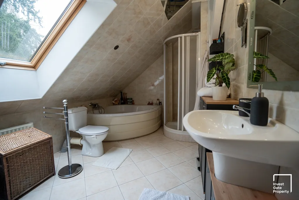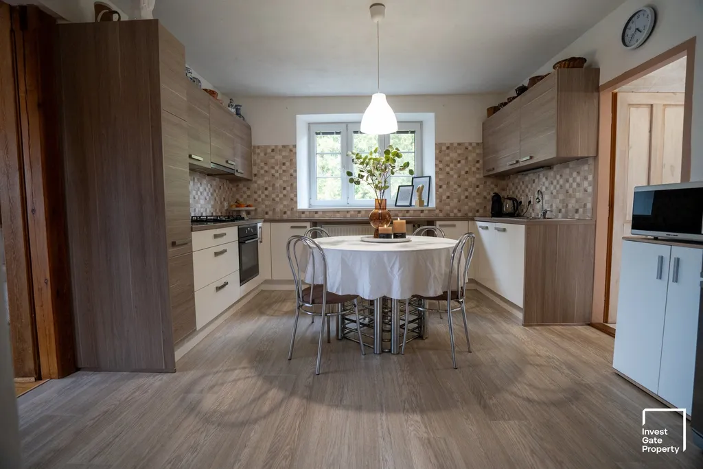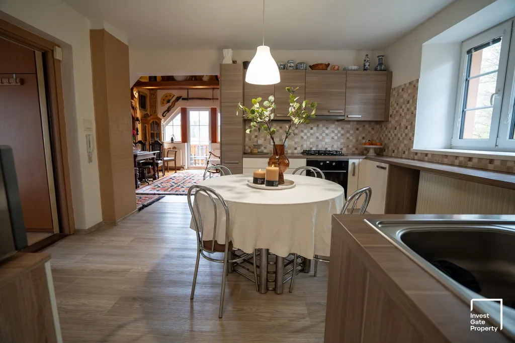 V patře domu se nachází bytová jednotka o dispozici 4+kk a výměře cca 90 m². Ta nabízí flexibilní využití – může sloužit jako komfortní zázemí pro majitele, nebo ji lze přeměnit na další prostorný apartmán pro rodiny s dětmi a dále tak rozšířit ubytovací kapacitu. V podzemním podlaží pak najdete útulné posezení s krbem a kuchyní, ideální pro společné chvíle hostů či rozšíření služeb.
